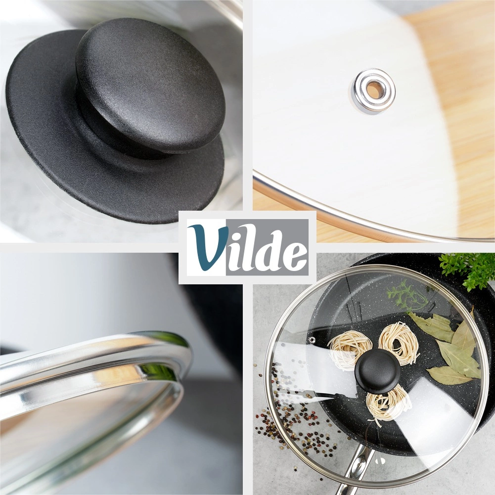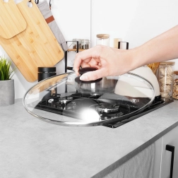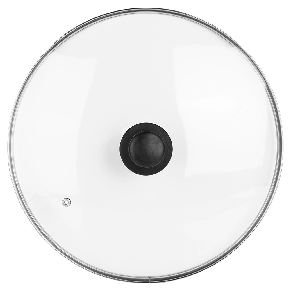 Zintegrowany otwór odpowietrzający reguluje nadmiar pary, a lekko wypukły kształt wspomaga cyrkulację gorącego powietrza. Ergonomiczny czarny uchwyt z wytrzymałego materiału wygodnie się trzyma i ułatwia manipulację. Pokrywka jest odpowiednia do zmywarki i wytrzymuje temperatury do +200 °C.