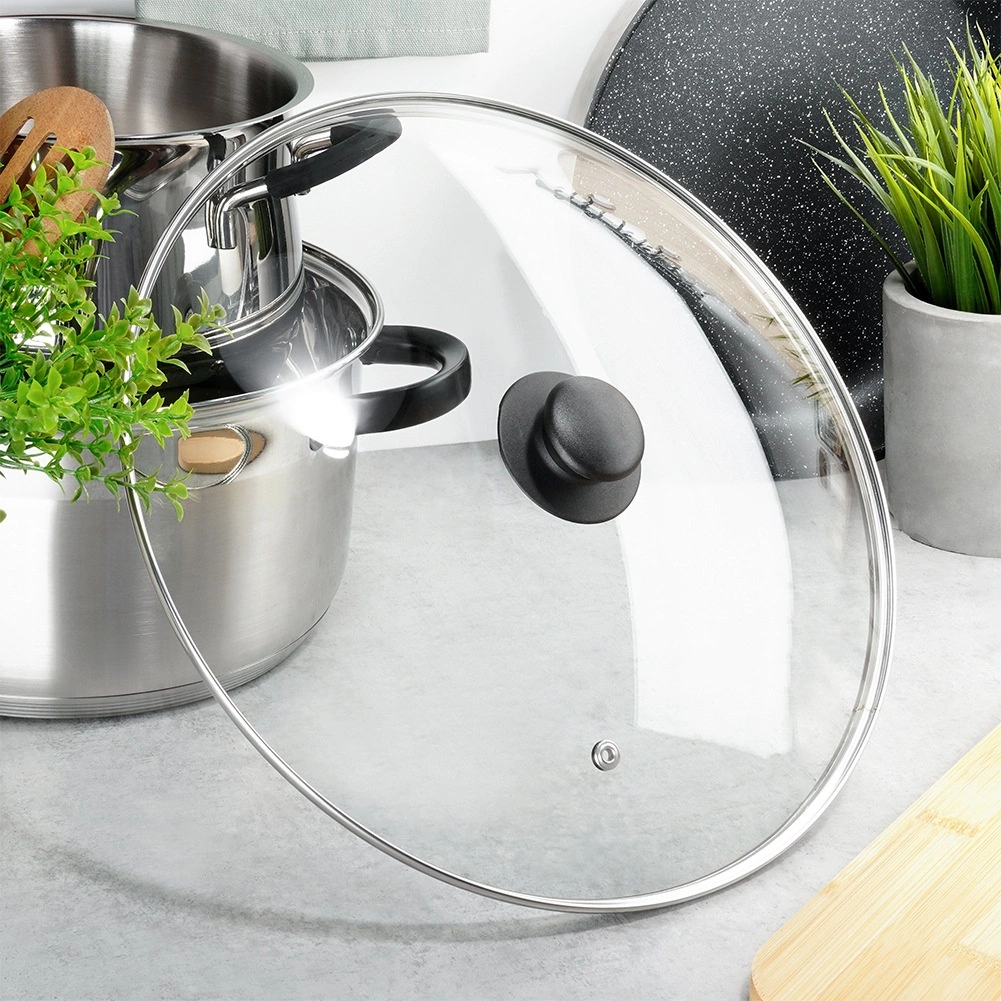 Ta uniwersalna szklana pokrywka doskonale pasuje do garnków, patelni i rondli o średnicy 32 cm. Dzięki przezroczystemu żaroodpornemu szkłu masz stałą kontrolę nad gotowaniem bez konieczności podnoszenia pokrywki, co oszczędza energię i czas. Stalowy rant zapewnia długą żywotność, a wysoki profil sprzyja stabilnemu i szczelnemu przyleganiu do naczynia.