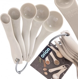 Miarki są wykonane z trwałego, bezpiecznego dla żywności plastiku, można je myć w zmywarce, a praktyczne kółko łączące gwarantuje, że poszczególne elementy się nie zgubią. Kółko można łatwo rozłączyć i używać miarek także oddzielnie.