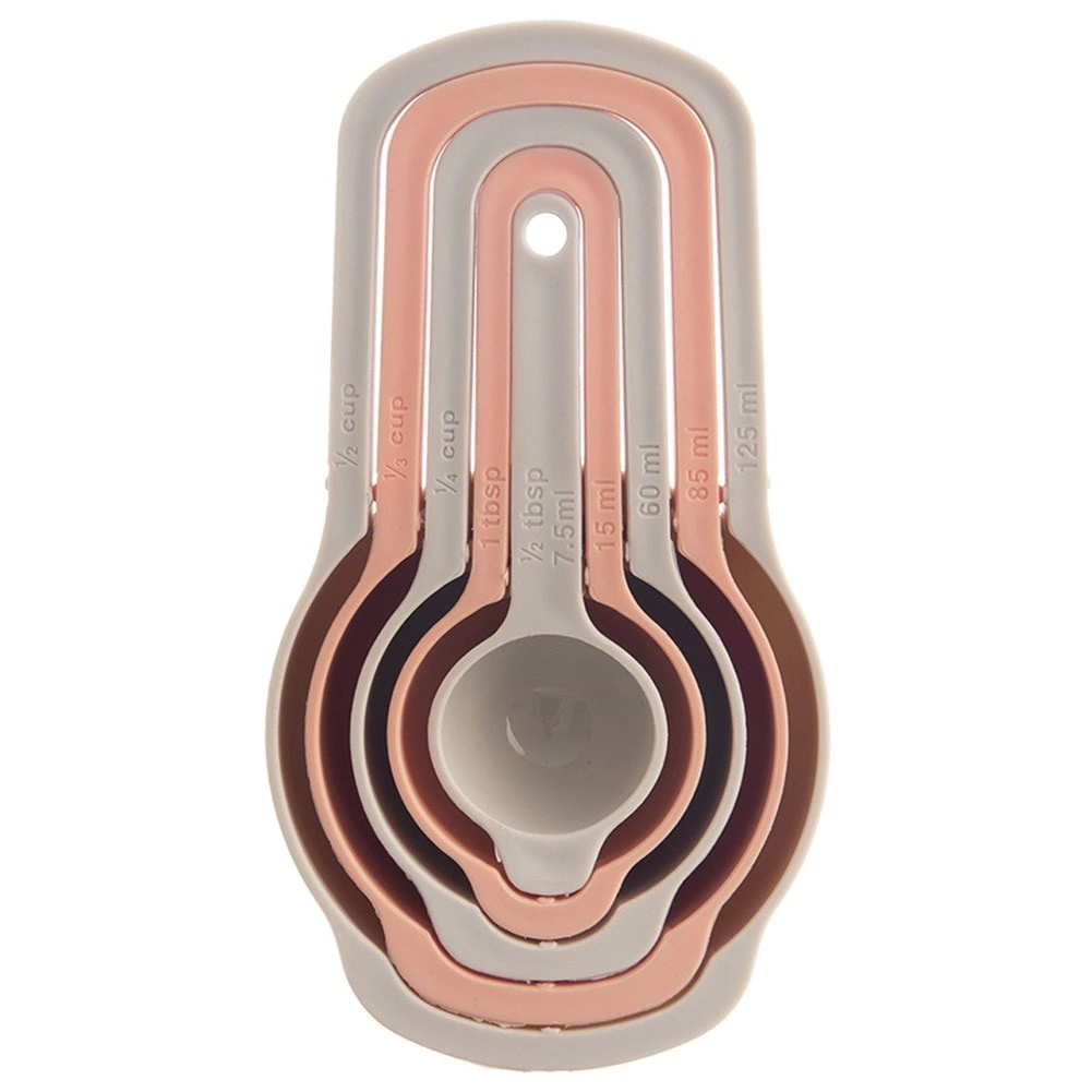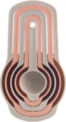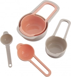 Praktyczny zestaw pięciu kuchennych miarek do precyzyjnego odmierzania składników podczas gotowania i pieczenia. Każda miarka ma wyraźne oznaczenia w ml, szklankach i łyżkach. Trwałe wykonanie z plastiku w kolorze beżowym i łososiowym, odpowiednie do zmywarki, możliwość sztaplowania dla oszczędności miejsca oraz idealne do suchych i płynnych składników.