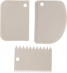 Praktyczny zestaw trzech cukierniczych szpachelek do gładkiego i strukturalnego zdobienia tortów i deserów. Zawiera gładkie i ząbkowane krawędzie do profesjonalnego wygładzania kremów, tworzenia dekoracyjnych wzorów oraz łatwego rozprowadzania polew. Lekki, wytrzymały materiał w beżowym kolorze, odpowiedni do zmywarki i kompaktowo połączony kółkiem dla wygodnego przechowywania.