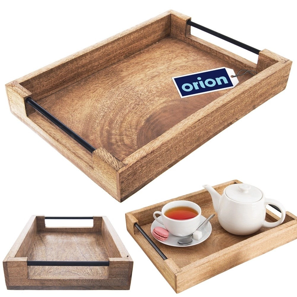 Stylowa drewniana taca z drewna mango o wymiarach 35,5 × 25,5 × 5,5 cm do wygodnego serwowania napojów i deserów. Posiada solidną konstrukcję, podwyższone krawędzie oraz czarne metalowe uchwyty dla bezpiecznego przenoszenia. Drewno mango jest odporne na wilgoć, szybko schnie i nie pochłania zapachów. Doskonale sprawdzi się w domu i w gastronomii, pasuje do industrialnego stylu LOFT.