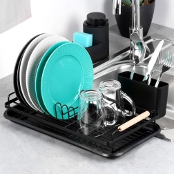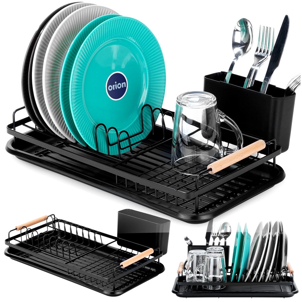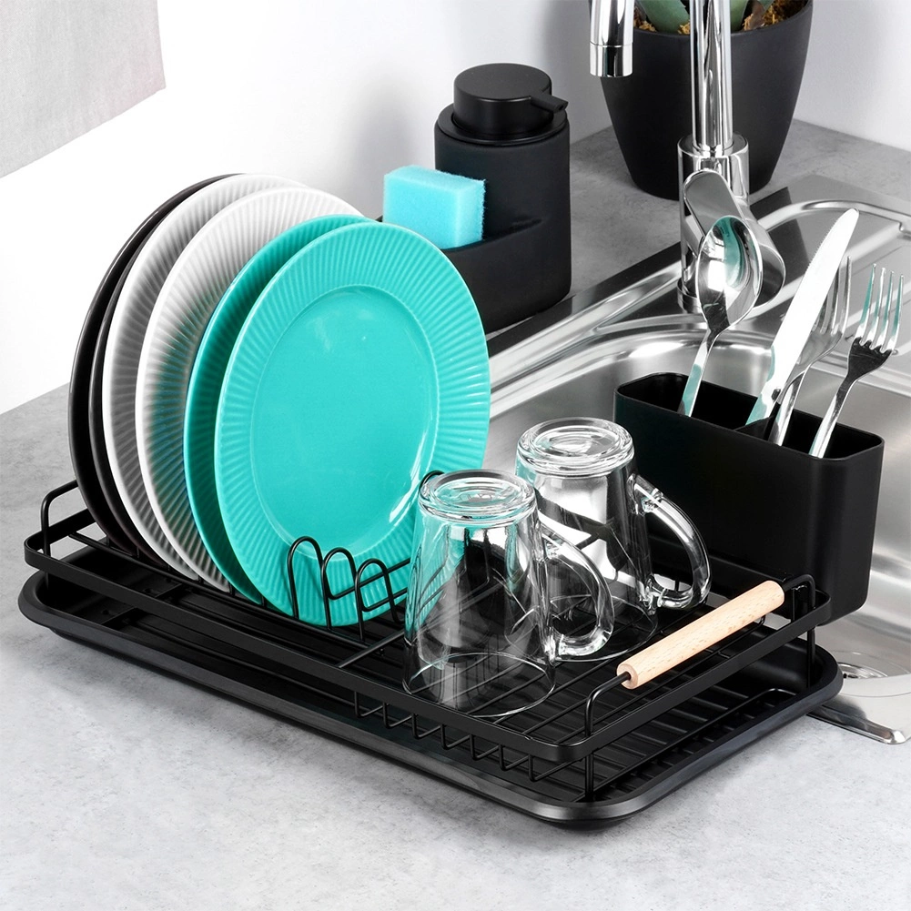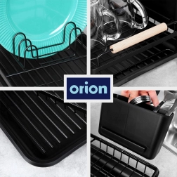 Stylowy i kompaktowy ociekacz na naczynia o wymiarach 43 × 23,5 × 9,5 cm oferuje miejsce na talerze, szklanki i sztućce. Ma wyjmowaną tackę ociekową, odłączany pojemnik na sztućce oraz drewniane uchwyty ułatwiające przenoszenie. Wytrzymała metalowa konstrukcja w matowej czerni chroni blat przed wodą i pomaga utrzymać porządek w kuchni.