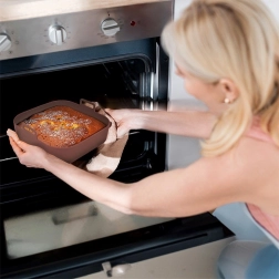 Wysokiej jakości silikon jest odpowiedni do kontaktu z żywnością, nie przywiera i ułatwia wyjmowanie potraw bez uszkodzeń.