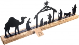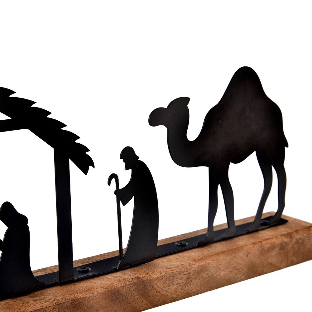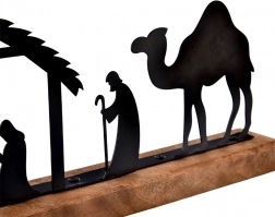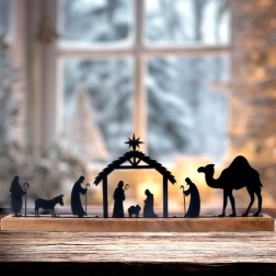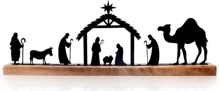 Precyzyjnie wycinane laserowo czarne sylwetki stajenki, Świętej Rodziny, pasterzy, zwierząt i wielbłąda tworzą wyrazisty, a zarazem stonowany świąteczny motyw.