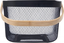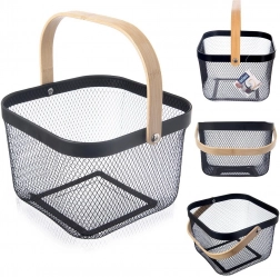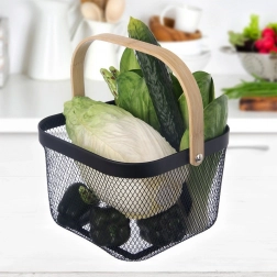 Ten praktyczny koszyk łączy wytrzymałą metalową siatkę z wygodnym bambusowym uchwytem, dzięki czemu łatwo go przenosić, a jednocześnie pomaga utrzymać porządek w każdym pomieszczeniu. Dzięki przewiewnej konstrukcji doskonale sprawdzi się do przechowywania owoców i warzyw, a także do uporządkowanego trzymania ręczników, kosmetyków i drobiazgów.