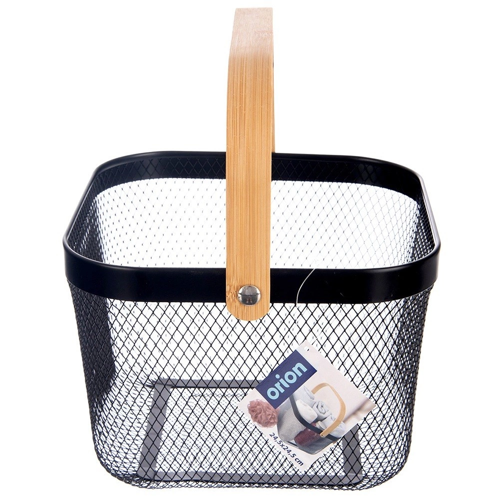 Elegancki czarny design pasuje do nowoczesnych i skandynawskich wnętrz oraz posłuży jako praktyczna dekoracja. Zewnętrzne wymiary koszyka to 27 × 24,5 × 17,5 cm, bez rączki 24,5 × 24,5 cm – idealny rozmiar na blat kuchenny, łazienkową konsolę czy półkę w salonie.