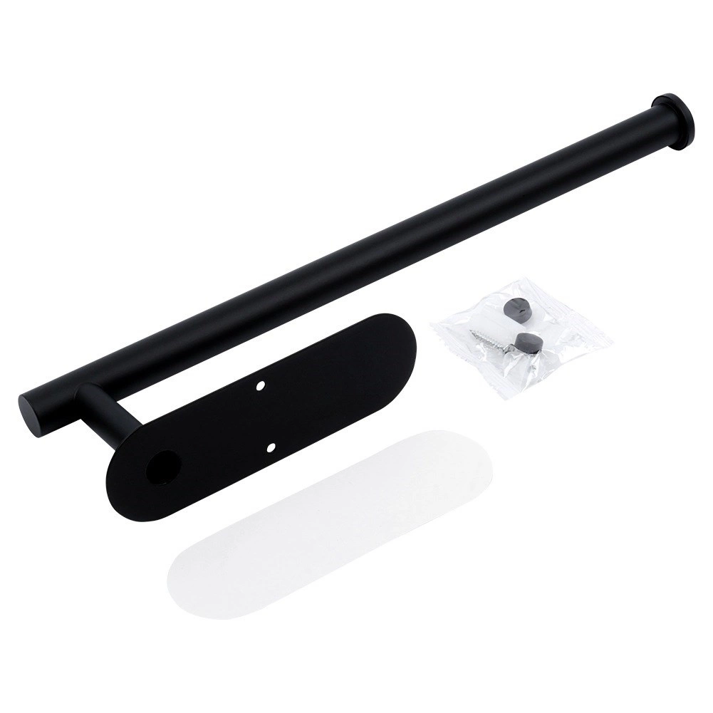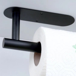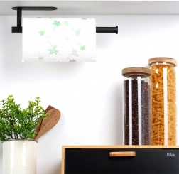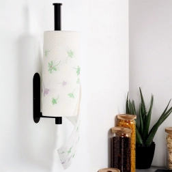 Praktyczny uchwyt na papierowe ręczniki z wytrzymałej stali nierdzewnej w czarnym kolorze do kuchni, łazienki i biura. Zapewnia szybkie odrywanie listków, oszczędność miejsca oraz łatwy dostęp podczas gotowania i sprzątania. W zestawie znajduje się taśma samoprzylepna i śrubki, dzięki czemu możesz wybrać montaż bez wiercenia lub na stałe.