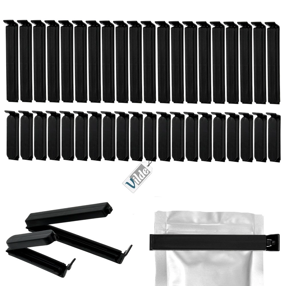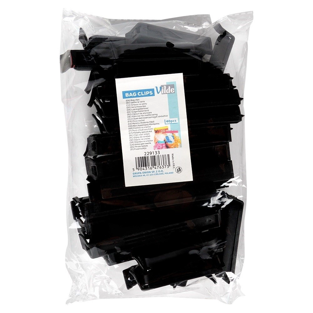Praktyczny zestaw 40 klipsów do torebek w dwóch rozmiarach pomaga dłużej utrzymać świeżość żywności i chroni ją przed wilgocią oraz dostępem powietrza. Wytrzymałe plastikowe klipsy w czarnym kolorze są łatwe w użyciu, szczelnie domykają i nadają się do kawy, przypraw, mrożonek, makaronów i roślin strączkowych. Oryginalny produkt Vilde.