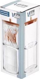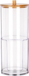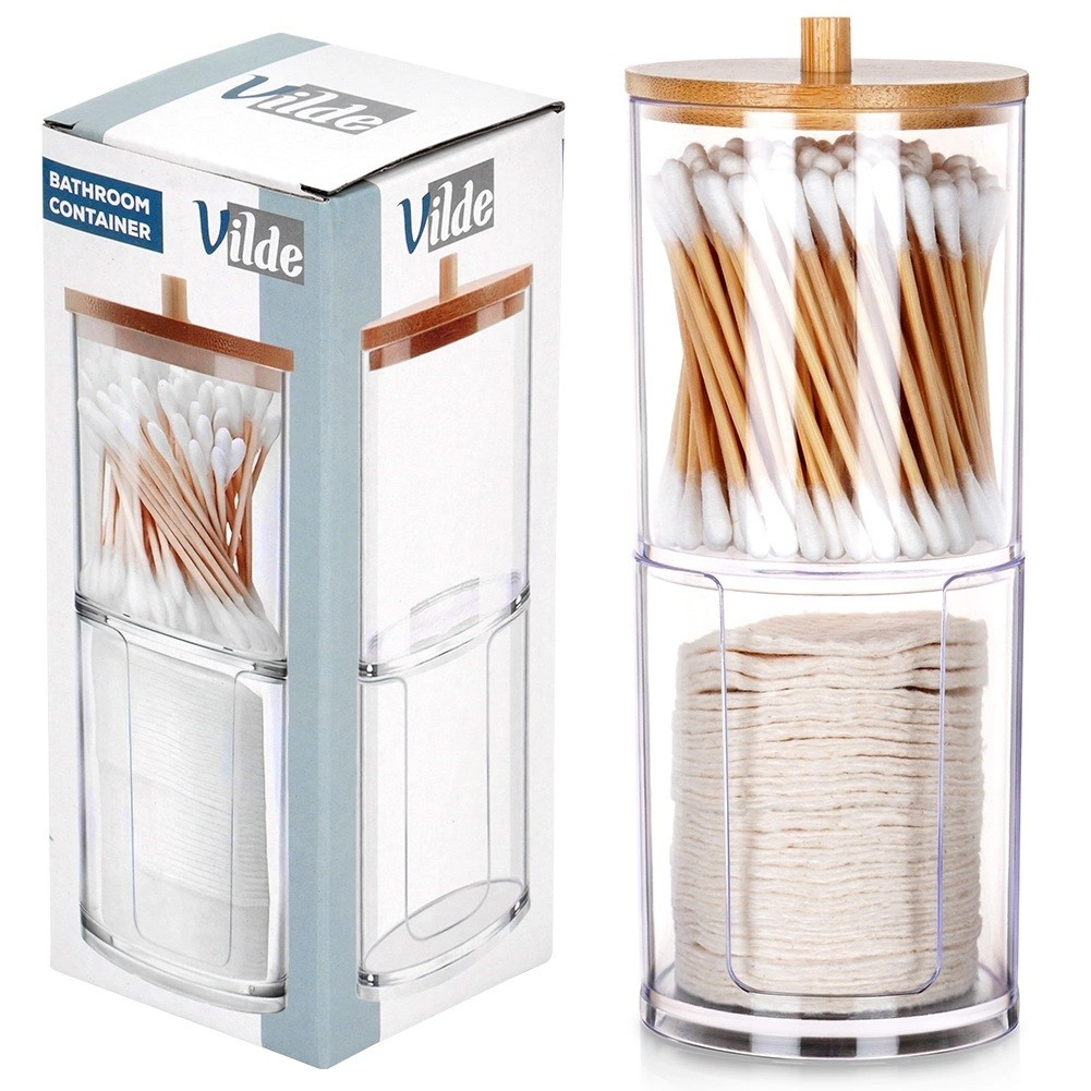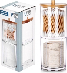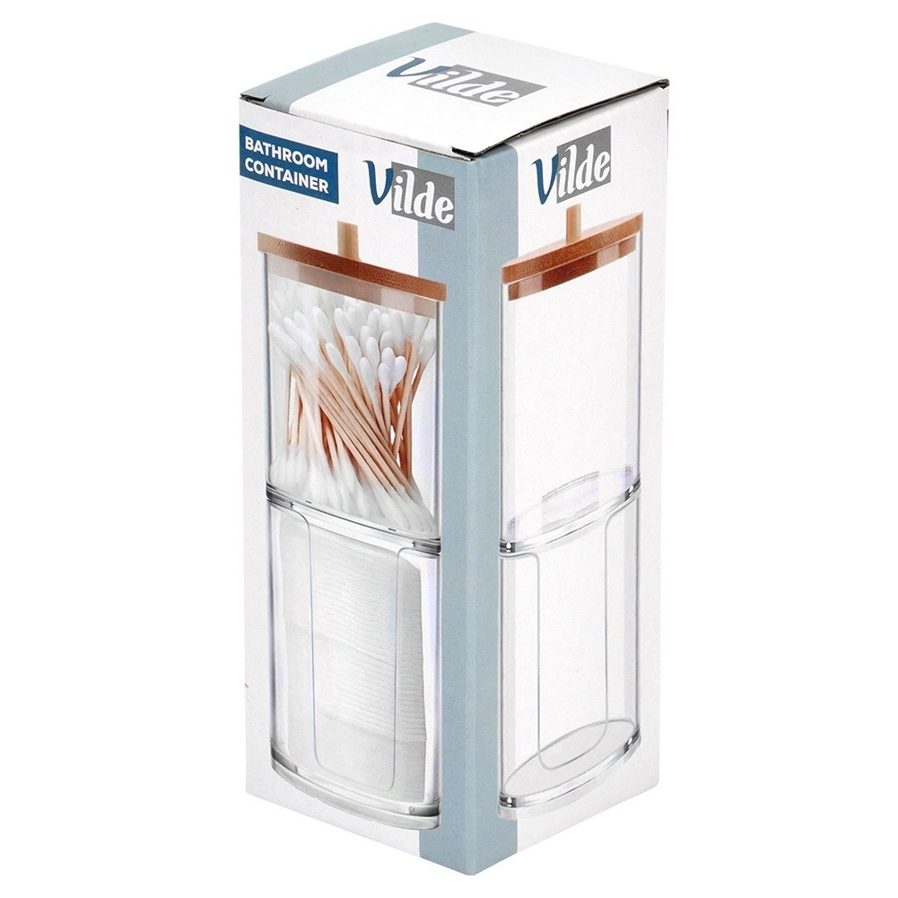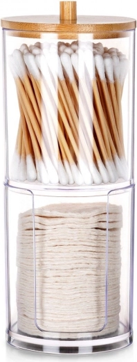 Elegancki i funkcjonalny dodatek do każdej łazienki. Dwie oddzielne przegrody z przejrzystego akrylu zapewniają higieniczne i uporządkowane przechowywanie patyczków higienicznych i okrągłych płatków. Górna część jest przykryta bambusową pokrywką z uchwytem, dolna sekcja ma przednie wycięcie ułatwiające dozowanie.