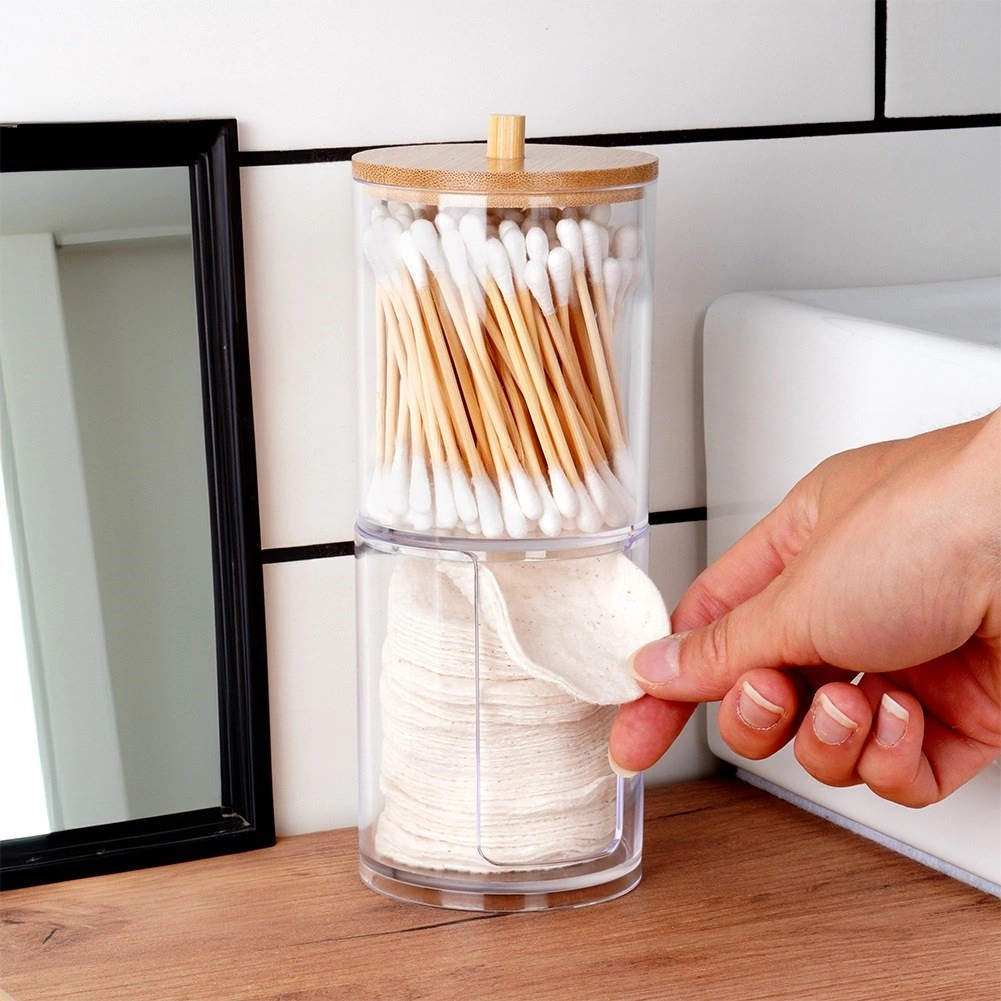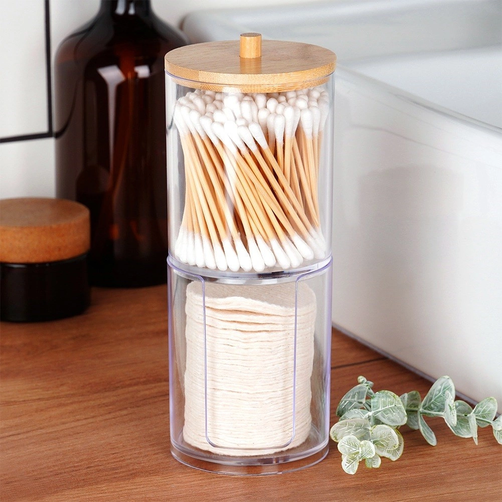 Utrzymaj porządek w łazience dzięki temu dwupoziomowemu organizerowi 2w1 na patyczki higieniczne i płatki kosmetyczne. Przezroczysty akryl umożliwia natychmiastową kontrolę zapasów, bambusowa pokrywka chroni przed kurzem, a dolna część oferuje praktyczny podajnik płatków do szybkiego użycia. Kompaktowa, pionowa konstrukcja oszczędza miejsce na blacie umywalki.