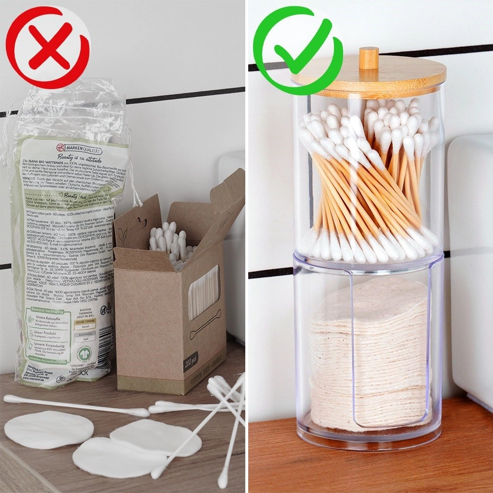 Oddziel patyczki higieniczne i płatki w jednym, kompaktowym organizerze. Przezroczysty materiał zapewnia natychmiastowy przegląd zawartości i elegancki wygląd.