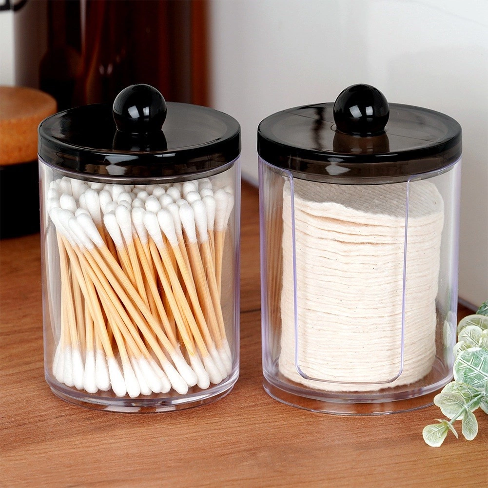 Praktyczny zestaw dwóch przezroczystych pojemników z akrylu na patyczki kosmetyczne i płatki do demakijażu. Kompaktowe wymiary, higieniczne wieczko z uchwytem chroniące przed kurzem oraz sprytny podajnik płatków dla szybkiego dostępu. Nowoczesny, minimalistyczny design pasuje do każdej łazienki.
