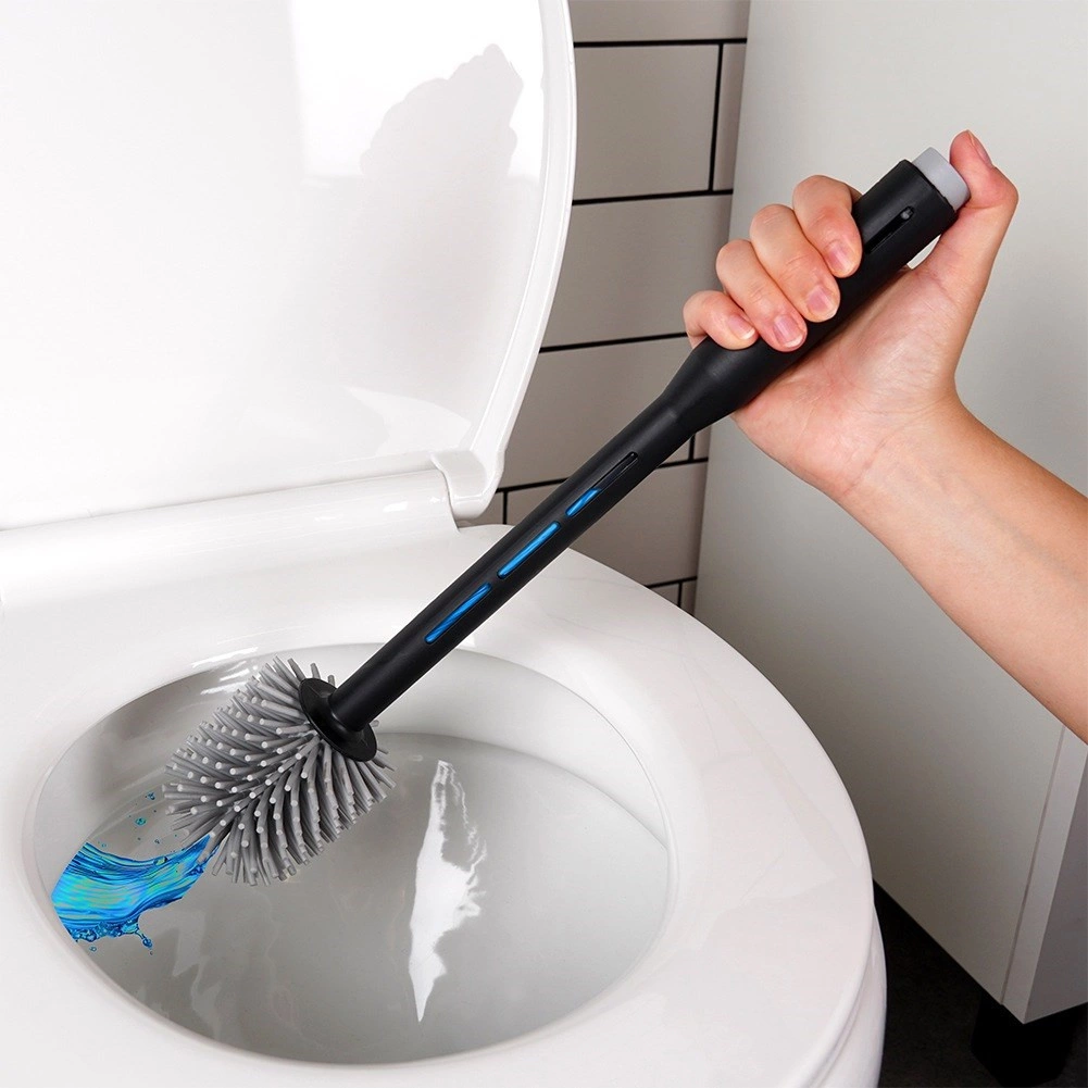 Ta nowoczesna szczotka do WC łączy trwałą silikonową główkę ze schowanym dozownikiem w rękojeści, dzięki czemu środek czyszczący masz zawsze pod ręką. Silikonowe włosie łatwo się spłukuje, szybko schnie i jest higieniczne – nie pochłania zabrudzeń ani zapachów.