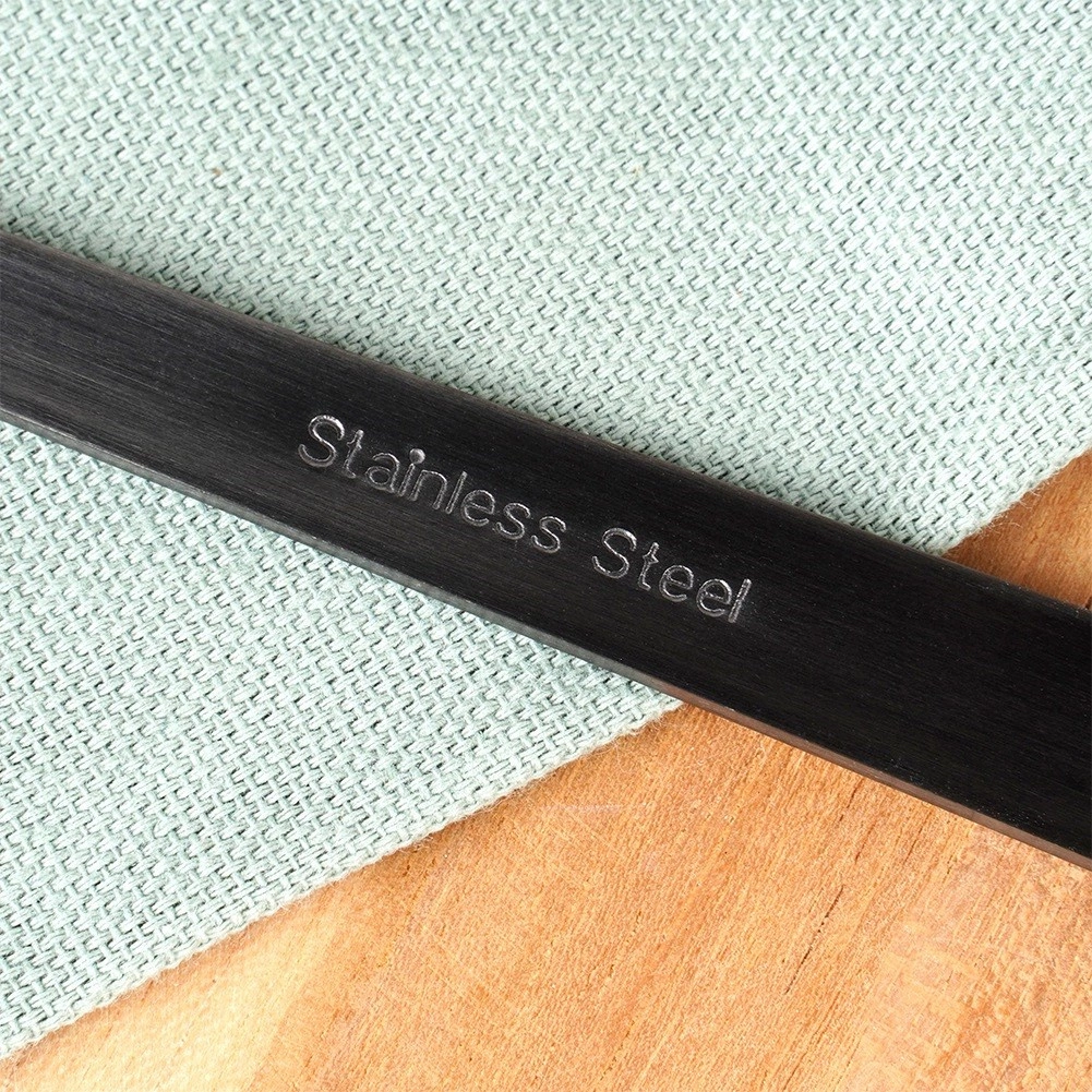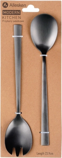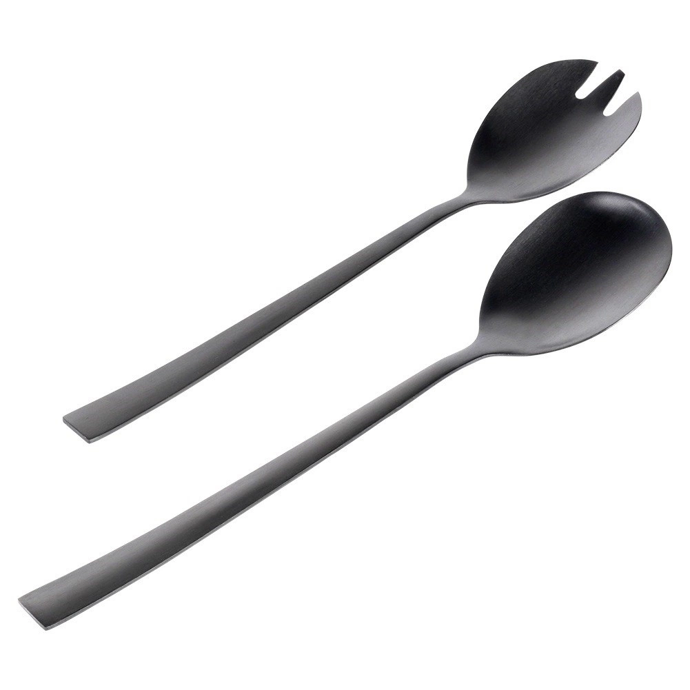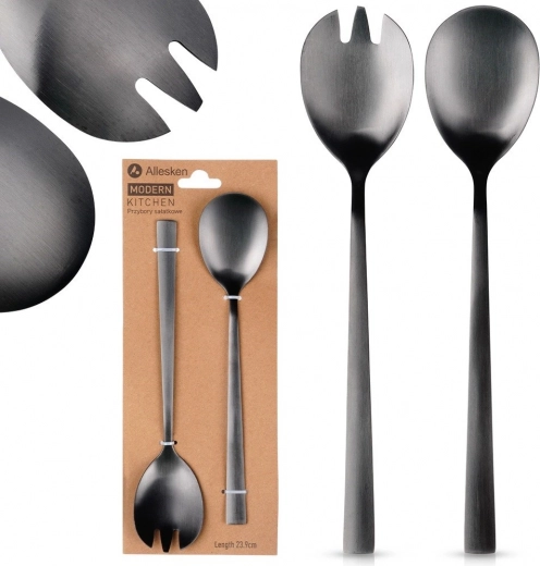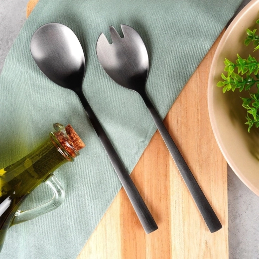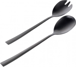 Zestaw dwóch łyżek do serwowania sałatek wykonany jest z wytrzymałej stali nierdzewnej w czarnym kolorze z delikatnym satynowym efektem. Oferuje idealną równowagę między nowoczesnym wyglądem a praktycznym zastosowaniem – doskonały do głębszych mis i misek sałatkowych.