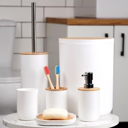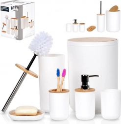Zestaw ujednolica wygląd łazienki i zapewnia wszystko, co potrzebne: dozownik, mydelniczkę, uchwyt na szczoteczki, kubek, szczotkę WC i kosz na śmieci. Minimalistyczny biały design z bambusem działa ciepło i czysto.
