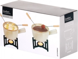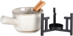 Ten kompaktowy zestaw do fondue łączy wysokiej jakości porcelanę w subtelnym beżowym odcieniu z wytrzymałym metalowym stojakiem w matowej czerni. Miska szybko się nagrzewa i długo utrzymuje temperaturę, dzięki czemu możesz delektować się roztopioną czekoladą, serem i innymi ciepłymi dipami dokładnie tak, jak lubisz.