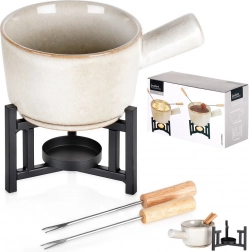 Podgrzewanie na świeczkę tealight zapewnia równomierne utrzymanie temperatury bez skomplikowanej obsługi. Dzięki dwóm widelczykom do fondue ze stali nierdzewnej z wygodnymi drewnianymi rękojeściami serwowanie jest proste i bezpieczne – idealne do maczania owoców, pieczywa, warzyw lub mięsa.