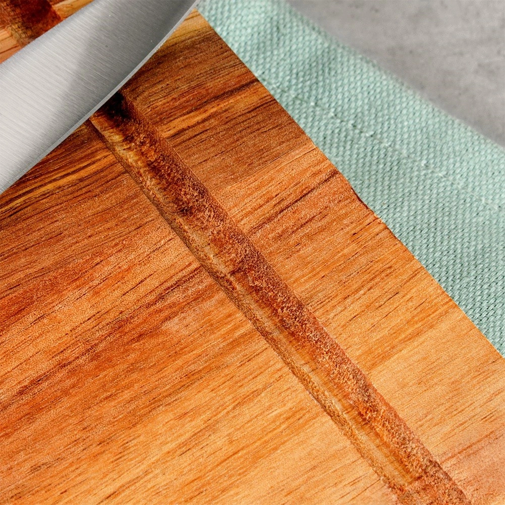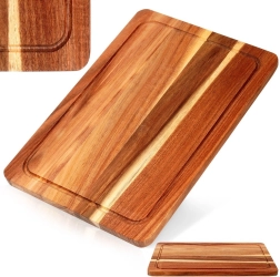 Praktyczna i stylowa deska z wysokiej jakości drewna akacjowego wyróżnia się naturalnym rysunkiem i wytrzymałością. Głęboki rowek ociekowy na całym obwodzie skutecznie zatrzymuje płyny i zapobiega ich spływaniu na powierzchnię roboczą. Deska nadaje się do krojenia mięsa, warzyw i owoców, a także sprawdzi się jako elegancka taca do serwowania serów, wędlin czy przekąsek.