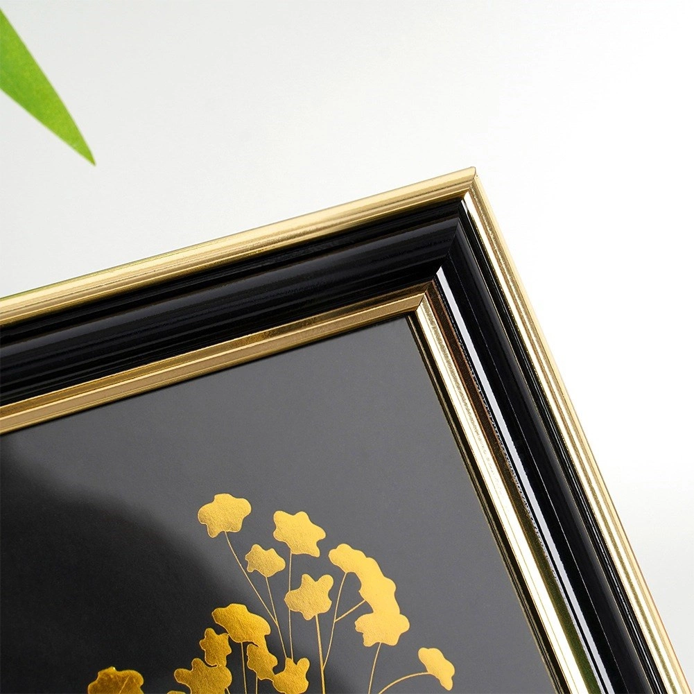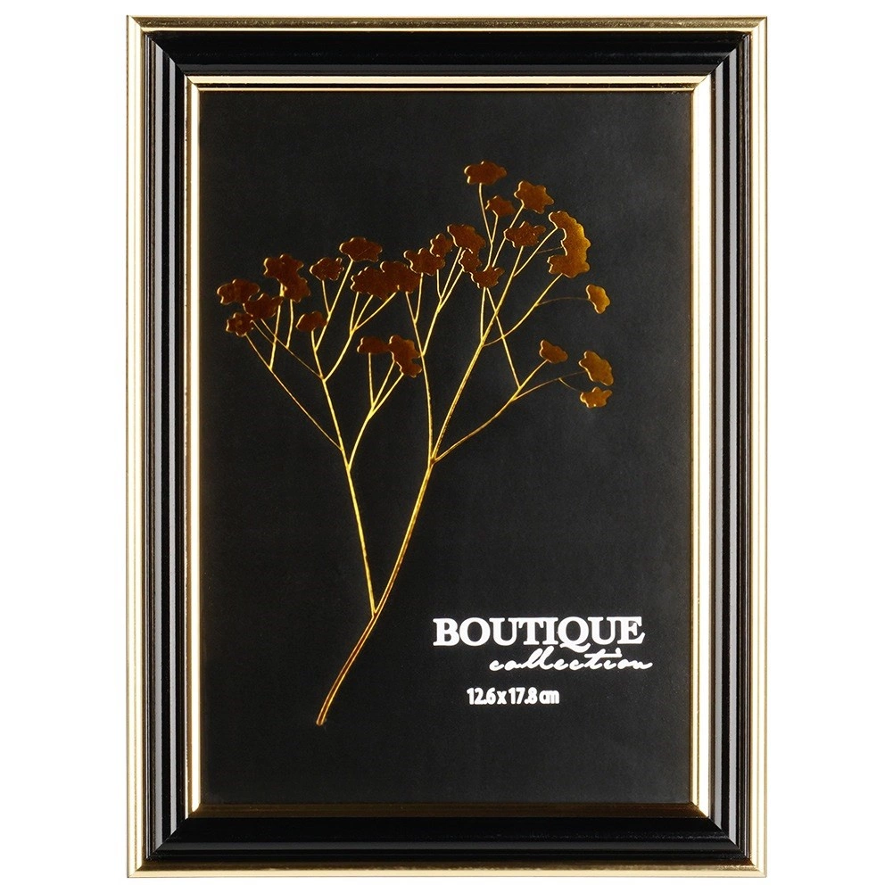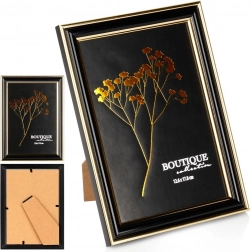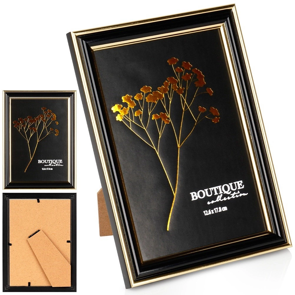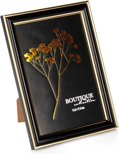 Elegancka ramka na zdjęcia w połączeniu czerni i złota dla fotografii w formacie 12,6 × 17,8 cm. Oferuje solidne i trwałe wykonanie, stylowy design oraz możliwość ustawienia pionowo i poziomo dzięki praktycznej podpórce.