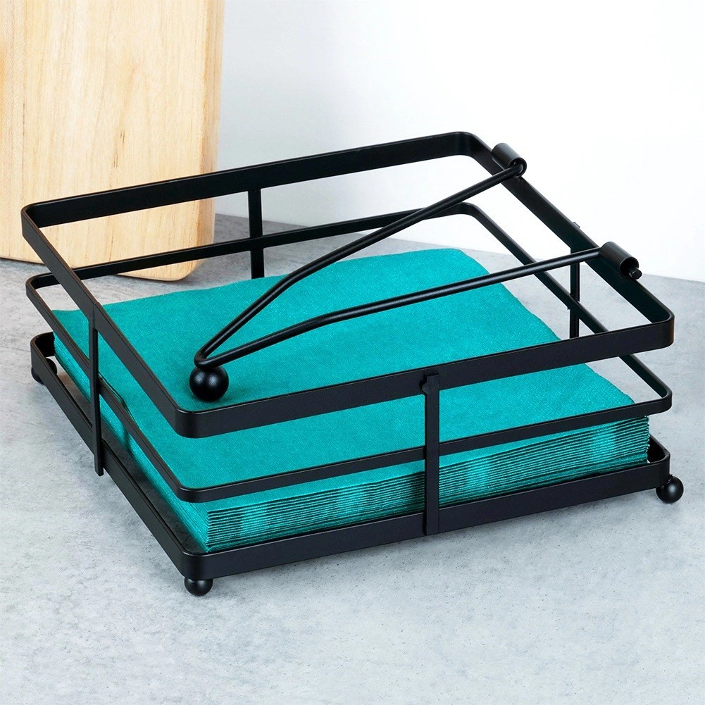 Elegancki metalowy stojak na serwetki z dociskiem utrzymuje serwetki zawsze na swoim miejscu – w domu i na zewnątrz. Ma solidną konstrukcję z metalu malowanego proszkowo na matową czerń i wymiary 18 × 18 × 7 cm. Idealny do kuchni, jadalni, ogrodu czy na taras. Stabilne dociążone ramię, trwały metal i uniwersalne zastosowanie czynią z niego praktyczny i dekoracyjny dodatek.