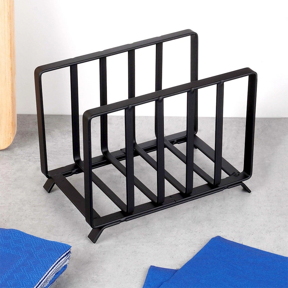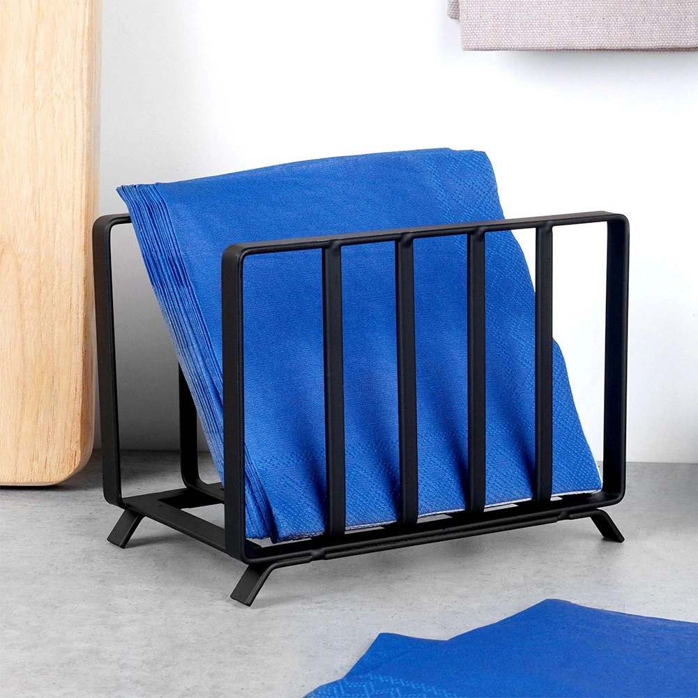 Stojak na serwetki Misty łączy funkcjonalność i styl. Wykonany jest z wysokiej jakości metalu z czarnym matowym lakierem proszkowym, odpornym na zarysowania i łatwym w utrzymaniu. Otwarta konstrukcja utrzymuje serwetki w pozycji pionowej i umożliwia ich szybkie i wygodne wyjmowanie.