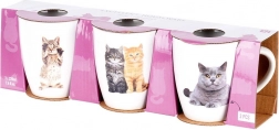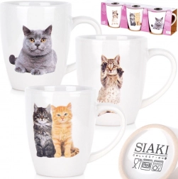 Odkryj elegancki zestaw 3 ceramicznych kubków o pojemności 220 ml, które zachwycają realistycznymi nadrukami kotów i błyszczącą białą powierzchnią. Klasyczny kształt z dużym uchem gwarantuje wygodny chwyt i przyjemne codzienne użytkowanie.
