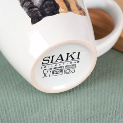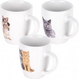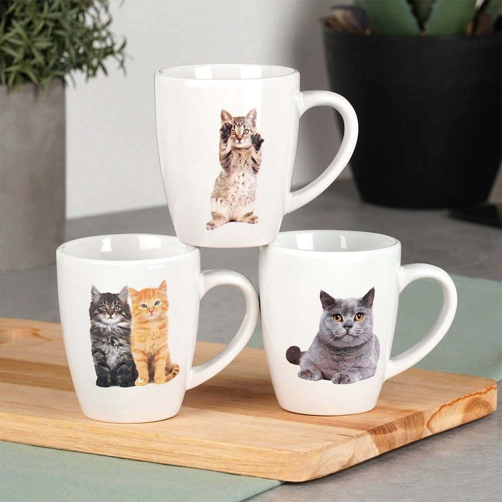 Każdy kubek zdobi realistyczny nadruk kota, który świetnie prezentuje się na błyszczącej białej ceramice i ociepla wygląd stołu.