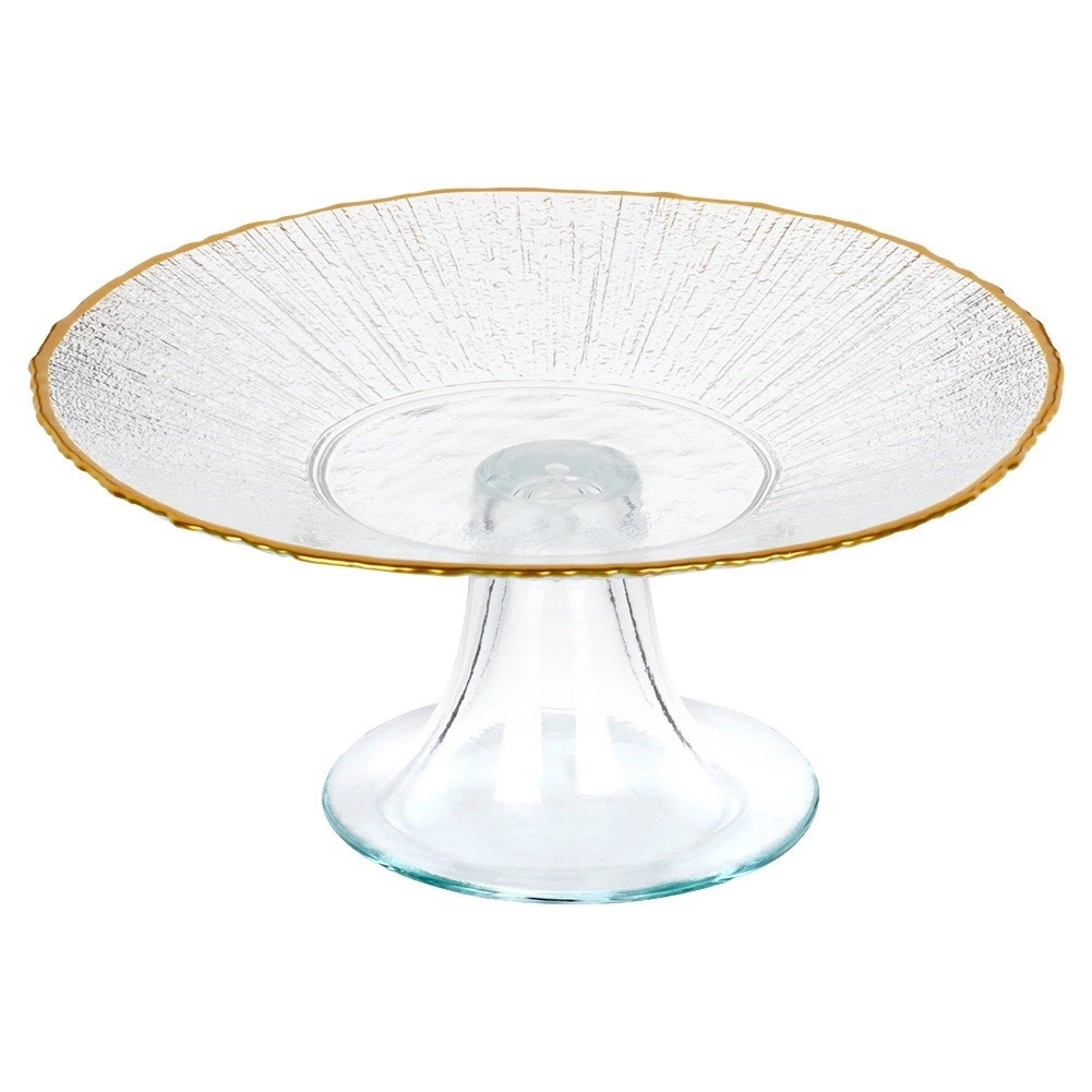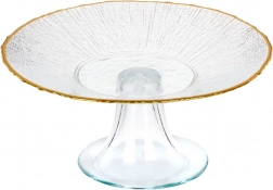 Ten stylowy szklany stojak na tort wyróżnia się czystą formą, przezroczystym szkłem i subtelną złotą krawędzią, która podkreśla odświętny charakter aranżacji. Podwyższona konstrukcja na nodze zapewnia wygodne krojenie i serwowanie, a jednocześnie pozwala deserom zabłysnąć.