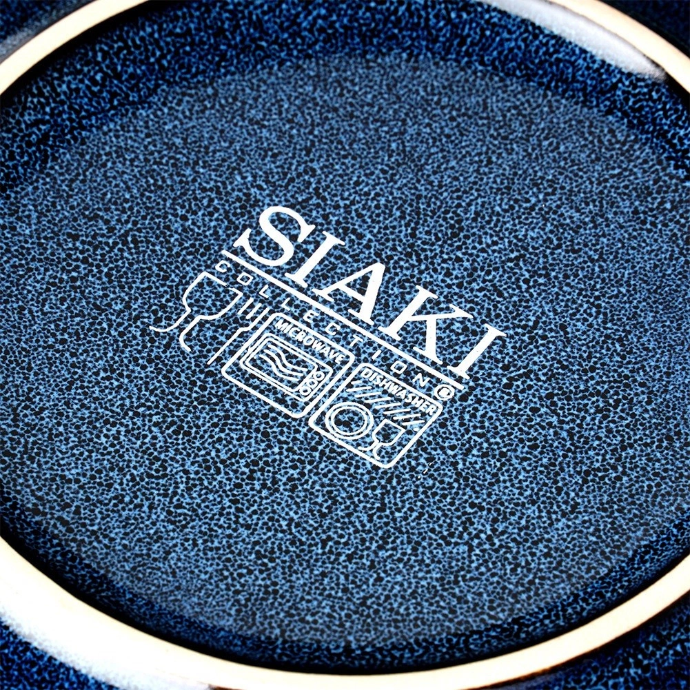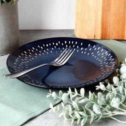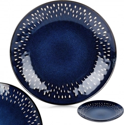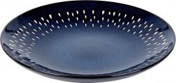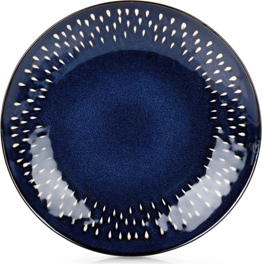 Głęboki niebieski odcień z dekoracyjnymi jasnymi kropkami wokół krawędzi nadaje nakrytemu stołowi nowoczesny i elegancki wygląd. Łatwo łączy się z inną ceramiką.
