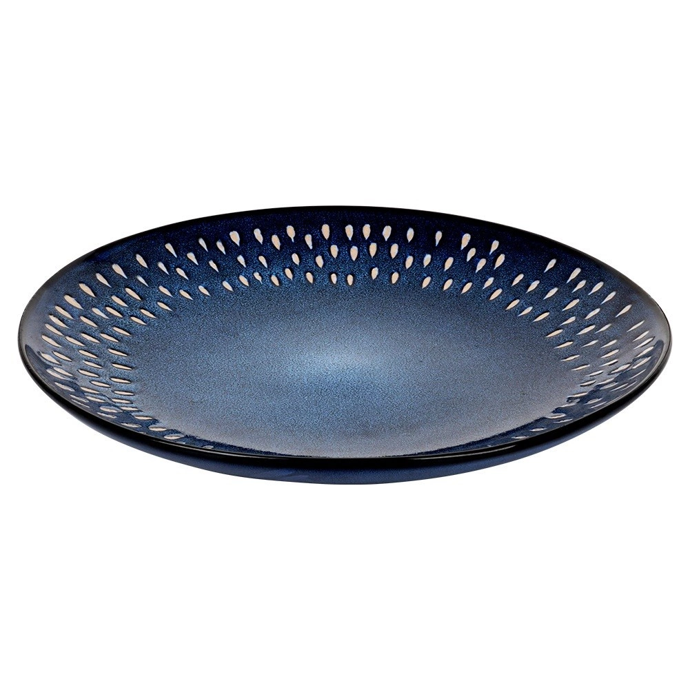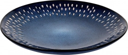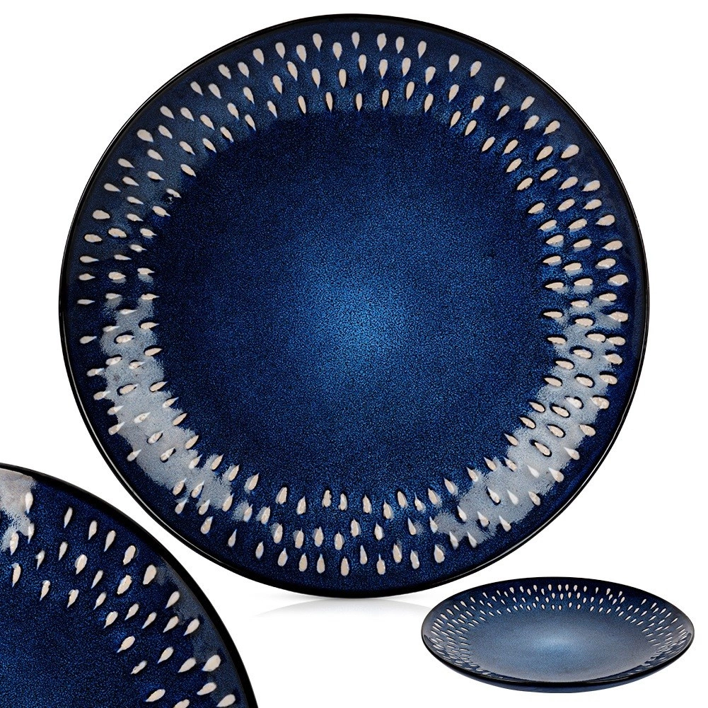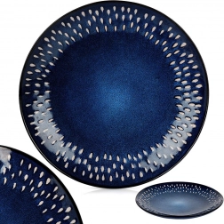 Elegancki płaski talerz o średnicy 28 cm z wytrzymałej kamionki w ciemnoniebieskim kolorze z dekoracyjnym wzorem kropli. Idealny do codziennego użytku i na wyjątkowe okazje, jest trwały, nadaje się do zmywarki i mikrofalówki, a także świetnie dopełnia nowoczesną zastawę.
