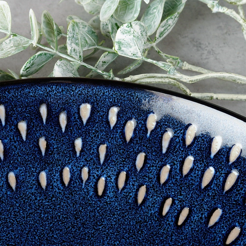 Ten stylowy płaski talerz łączy ponadczasowy okrągły kształt z wyrazistą glazurą w odcieniach granatowego oraz subtelnymi białymi akcentami w kształcie łez na obwodzie. Kamionka (gres) wyróżnia się wyższą wytrzymałością i odpornością na uszkodzenia, dzięki czemu sprawdza się w codziennym użytkowaniu i intensywnej eksploatacji.