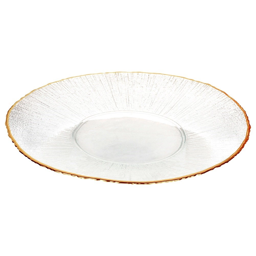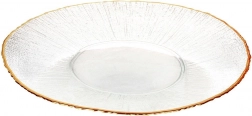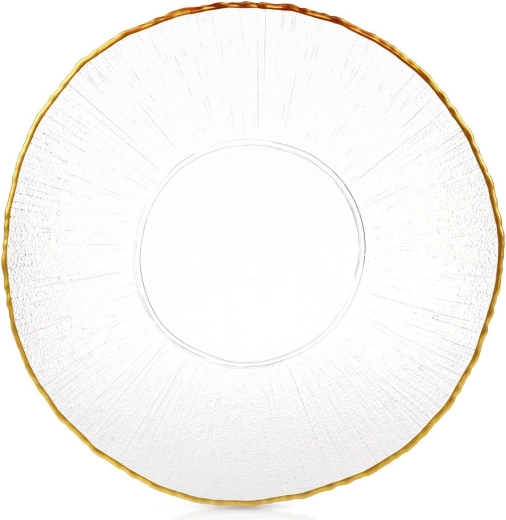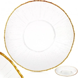 Elegancki szklany talerz o średnicy 28 cm ze złotą krawędzią i delikatną fakturą przypominającą kryształ. Idealny do serwowania dań głównych, deserów i przystawek. Uniwersalne zastosowanie na co dzień i na uroczyste okazje. Łatwa pielęgnacja, zalecane mycie ręczne w celu zachowania pięknego wyglądu.