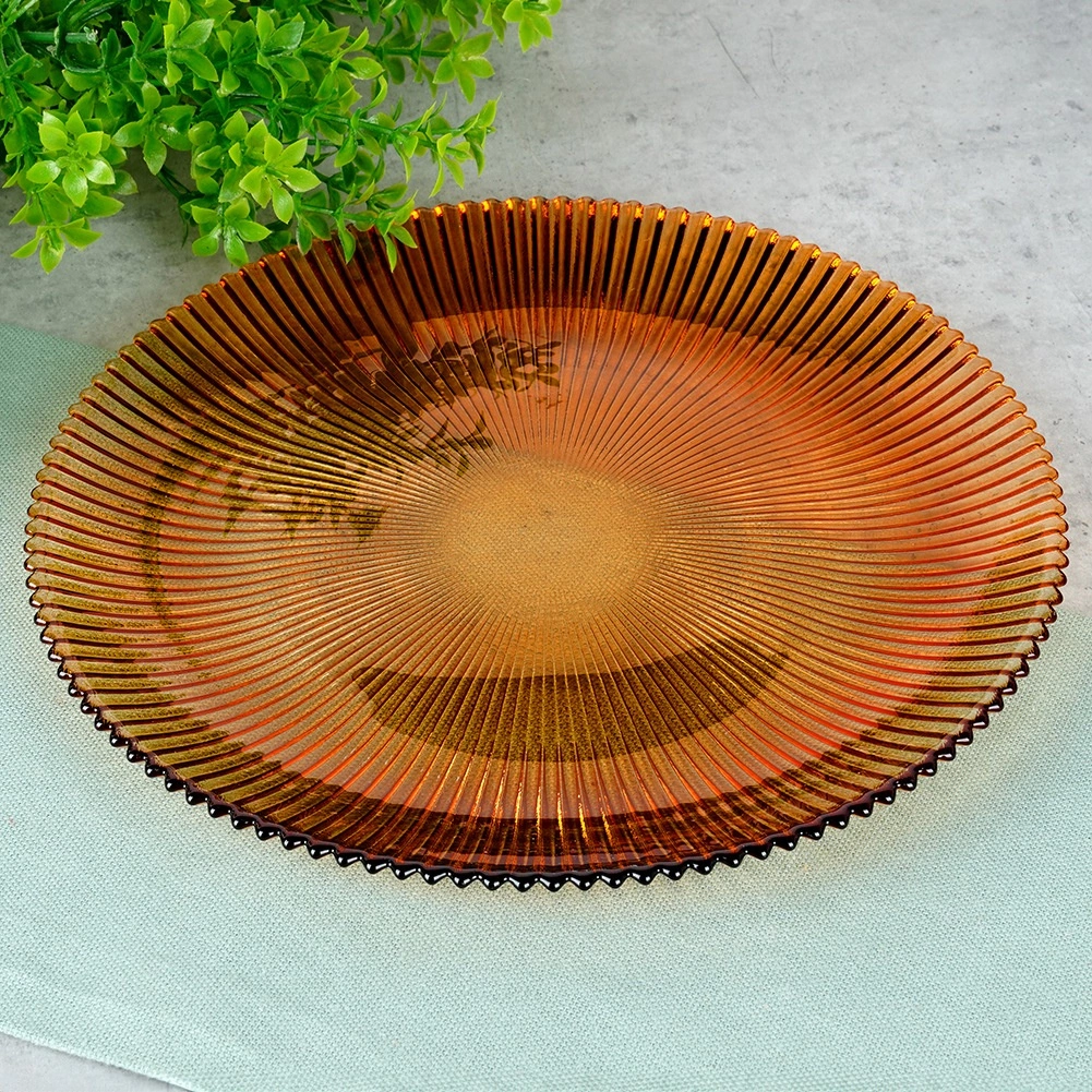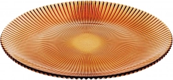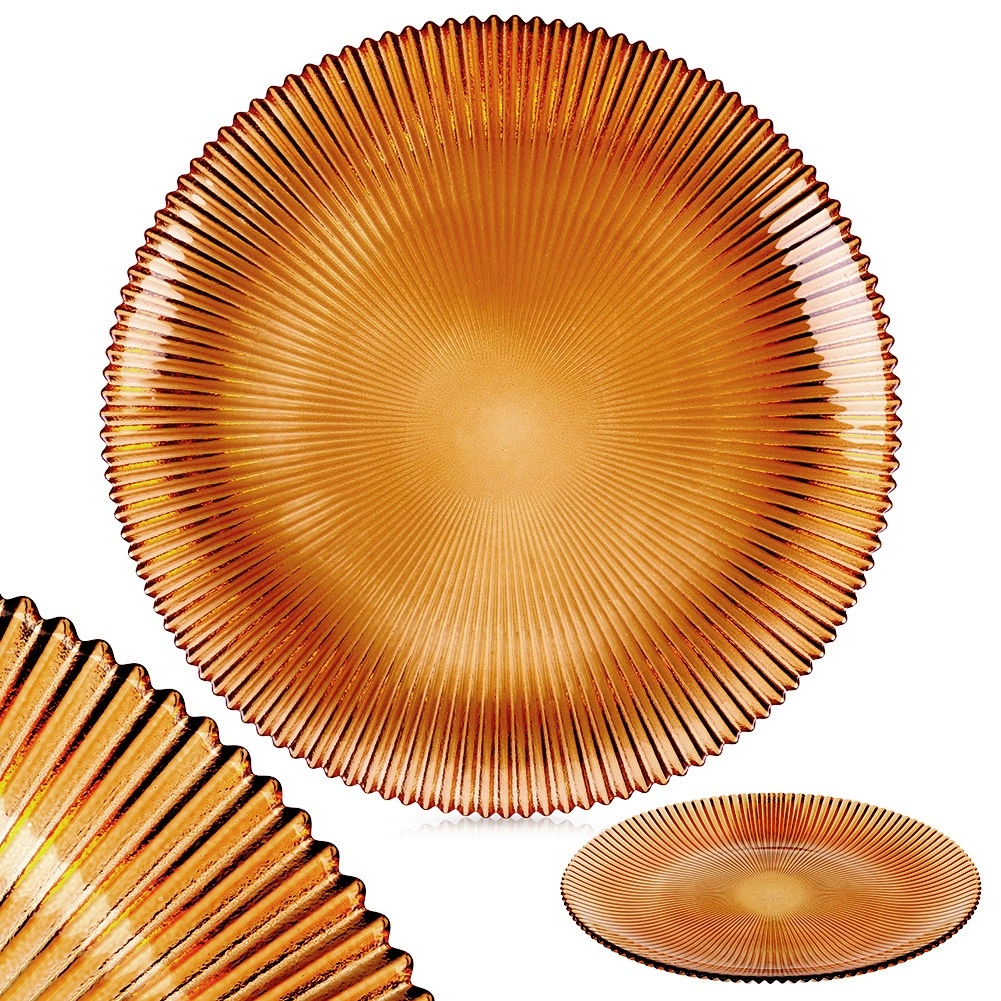 Stylowy szklany talerz deserowy o średnicy 21 cm w ciepłym bursztynowym odcieniu doda nakryciu stołu eleganckiego charakteru. Wykonany z wytrzymałego szkła z wyrazistą promienistą fakturą, która poprawia chwyt i wygląd. Idealny do serwowania deserów, przystawek czy śniadań. Elegancki design, bursztynowy kolor, odporne szkło i łatwa pielęgnacja do codziennego i odświętnego użytku.