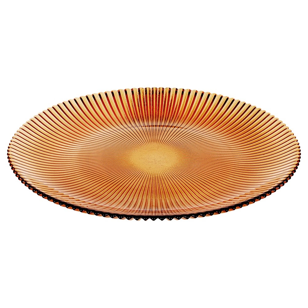 Postaw na ponadczasową elegancję: ten talerz deserowy z przezroczystego szkła w kolorze bursztynu wyróżnia się reliefowym promienistym wzorem i delikatnie pofalowaną krawędzią. Dzięki średnicy 21 cm jest idealny do tortów, ciast, deserów, owoców i mniejszych dań słonych.