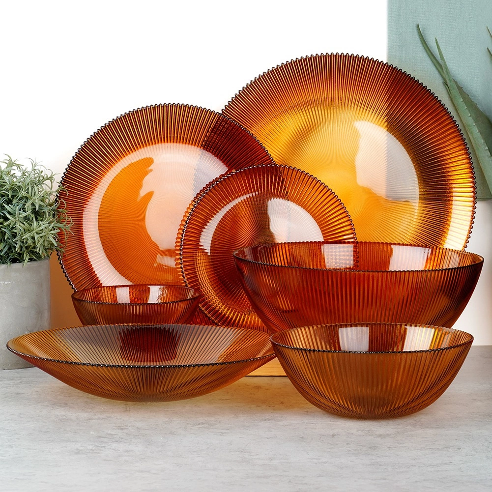 Ciepły bursztynowy odcień i lśniące szkło nadają nakryciu stołu luksusowy wygląd, który doskonale współgra zarówno z nowoczesnym, jak i klasycznym wystrojem.