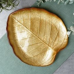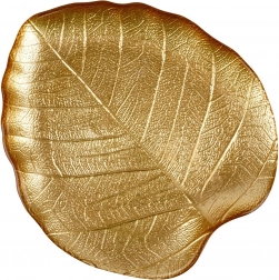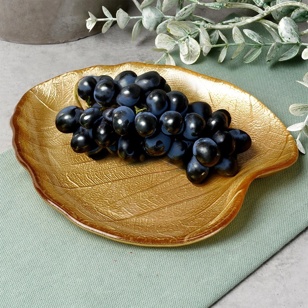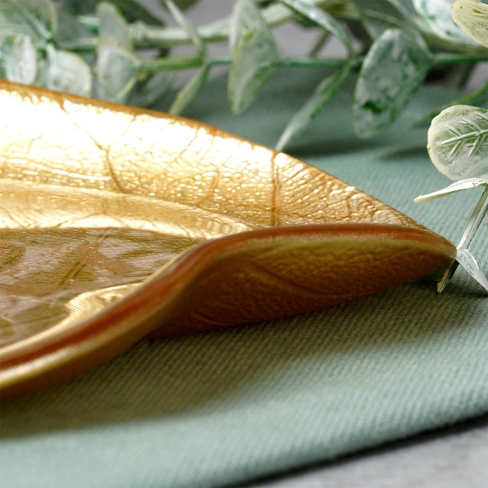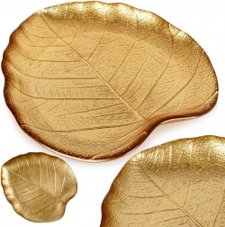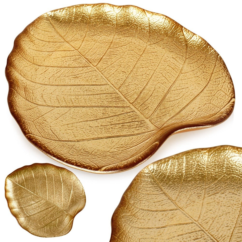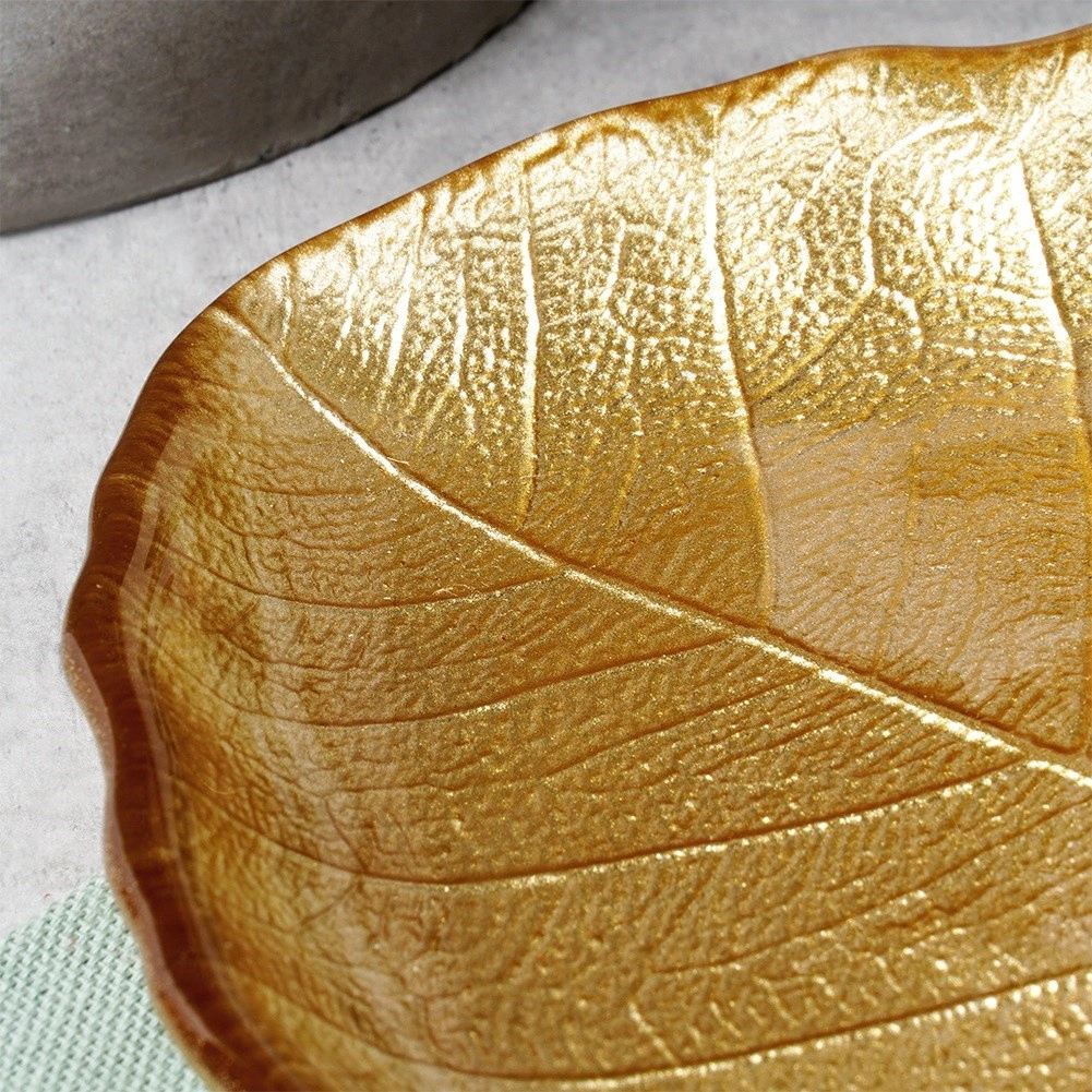 Stwórz efektowną atmosferę z eleganckim talerzem w kształcie liścia w metalicznym złocie. Wysokiej jakości szkło z reliefowym rysunkiem żyłek wygląda luksusowo i z łatwością komponuje się zarówno z nowoczesną, jak i klasyczną zastawą. Kompaktowy rozmiar 18 × 16 × 2 cm jest idealny do drobnego poczęstunku i dekoracji.