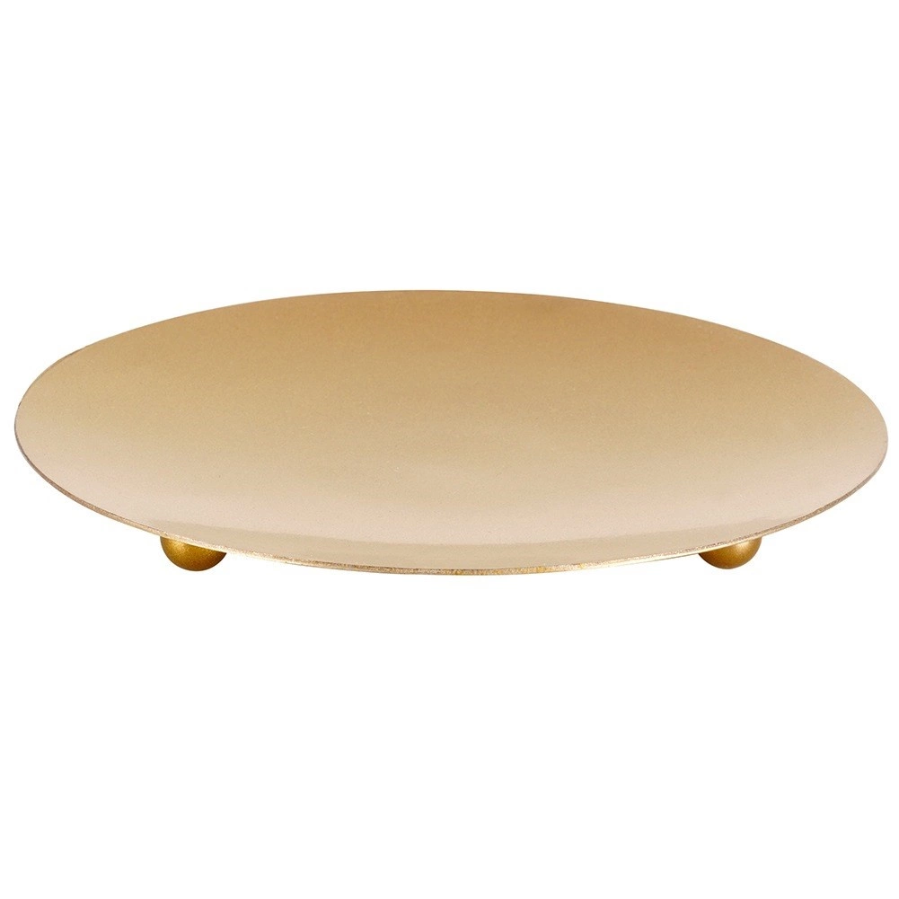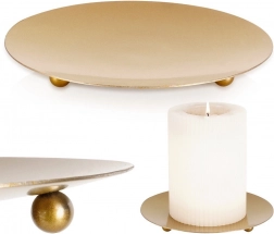 Elegancka metalowa podstawka pod świece o średnicy 12 cm ze stabilnymi kulistymi nóżkami chroni meble przed ciepłem i woskiem. Minimalistyczny design w matowym, złotym kolorze dodaje wnętrzu nowoczesnego i ponadczasowego akcentu, jest trwała, stabilna i świetnie sprawdzi się w aranżacjach dekoracyjnych oraz do codziennego użytku.