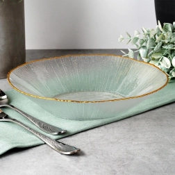 Ta stylowa miska z przejrzystego szkła z dekoracyjnym złotym brzegiem wyróżnia się nowoczesnym kształtem i nieregularną falą, która przypomina szlifowany kryształ. Doskonała do codziennego użytku i odświętnego stołowania – od sałatek warzywnych i owocowych po przekąski, popcorn czy mniejsze porcje makaronu.