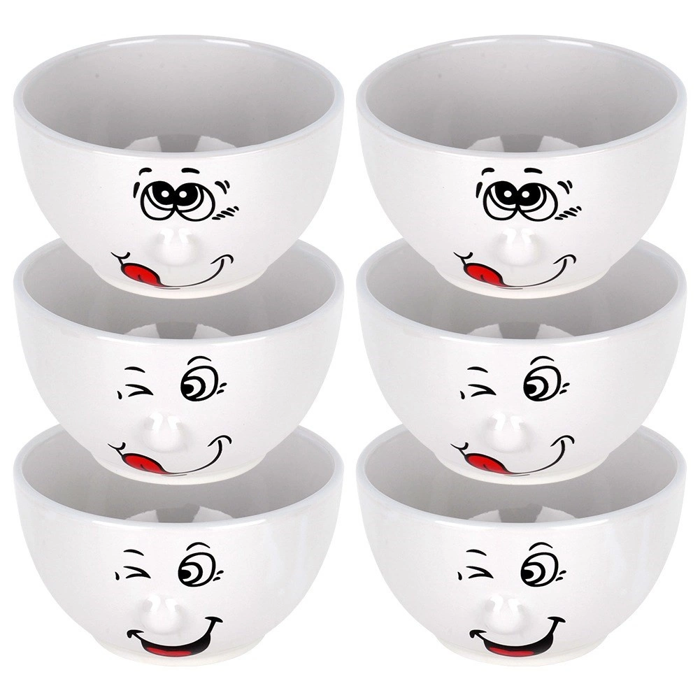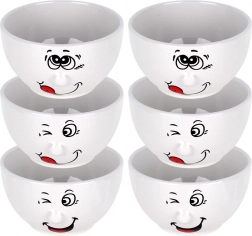 Praktyczny i stylowy zestaw misek, który zachwyca humorystycznym dekorom z buźkami, a jednocześnie oferuje uniwersalne zastosowanie do codziennego serwowania. Dzięki pojemności 550 ml są idealne na zupy, kremy, musli, sałatki i drobne przekąski. Błyszcząca biała ceramika świetnie prezentuje się w każdej kuchni i łatwo łączy się z innym naczyniem.