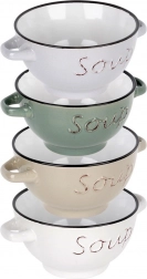 Każda miska ma praktyczne boczne uchwyty dla bezpiecznego przenoszenia. Wysokiej jakości ceramika dobrze trzyma ciepło i jest łatwa w utrzymaniu – miski można myć w zmywarce i podgrzewać w kuchence mikrofalowej. Zestaw czterech neutralnych kolorów (biały, beżowy, szary, zielony) pasuje do nowoczesnych i tradycyjnych wnętrz.
