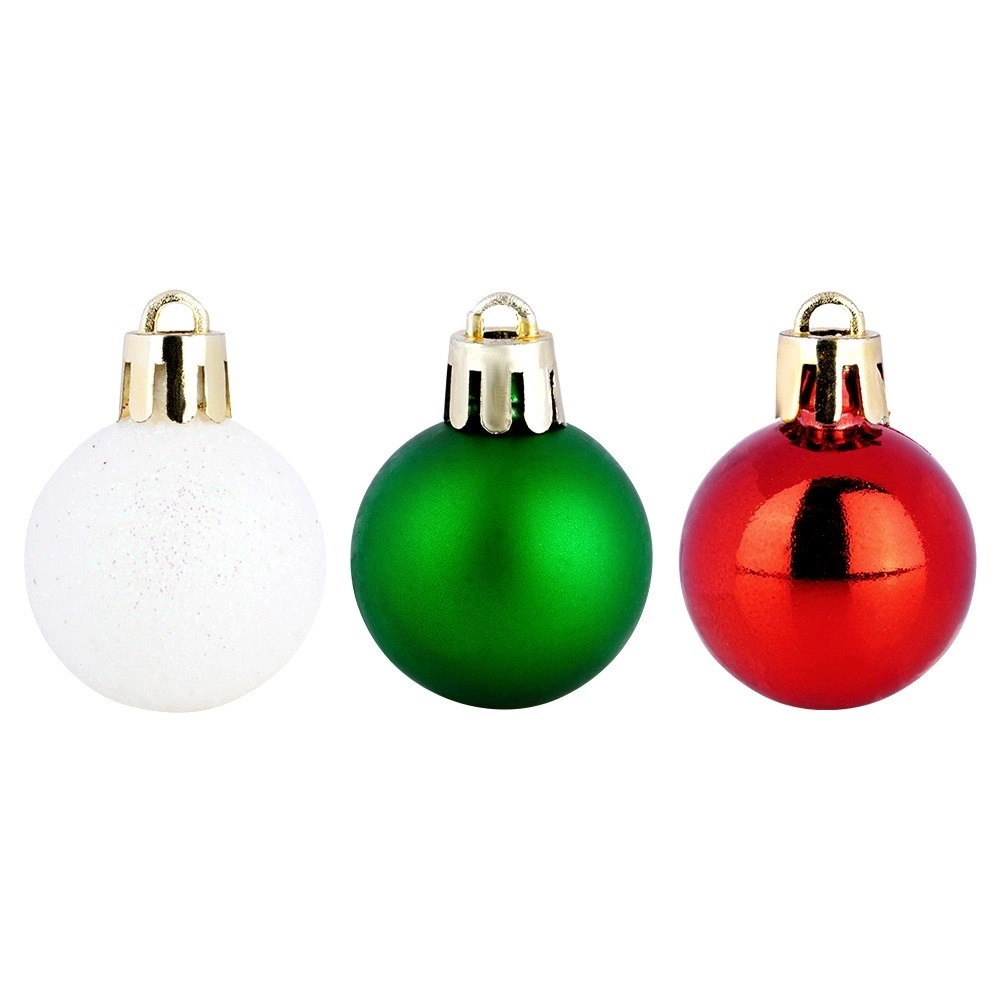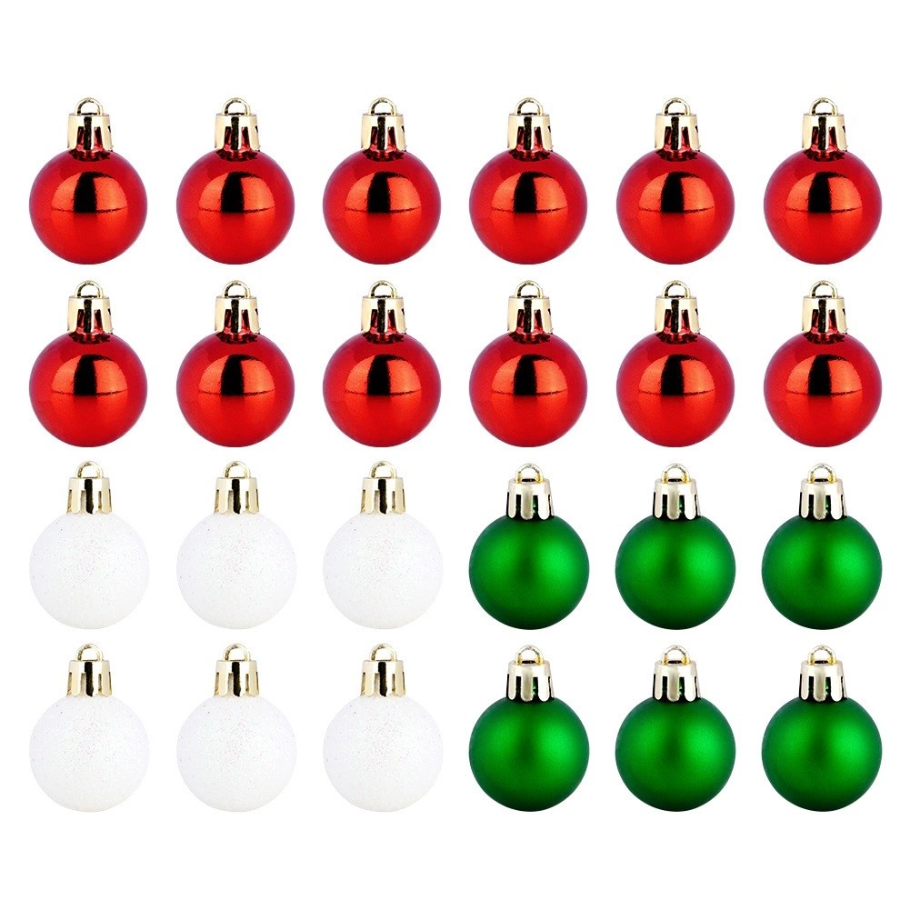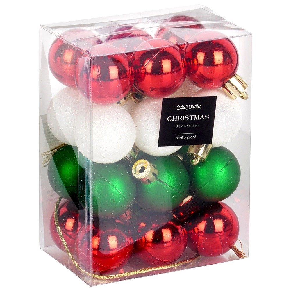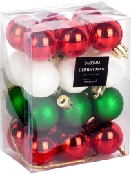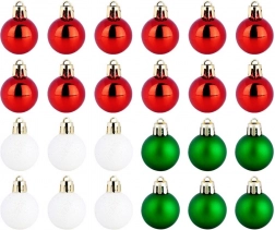 Ten elegancki zestaw zawiera 24 małe bombki świąteczne w tradycyjnych kolorach – czerwonym, zielonym i białym. Dzięki nietłukącemu plastykowi ozdoby są lekkie, trwałe i bezpieczne, a wyglądem przypominają szkło. Połączenie połyskujących, matowych i brokatowych powierzchni tworzy harmonijny, świetlisty efekt na każdej choince.