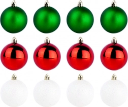 Udekoruj swoją choinkę w klasycznych, świątecznych barwach. Zestaw zawiera 12 bombek o średnicy 6 cm: 4× czerwone połyskliwe, 4× zielone matowe i 4× białe brokatowe. Dzięki połączeniu wykończeń dekoracja zyskuje głębię, kontrast i elegancję, pasując zarówno do nowoczesnych, jak i tradycyjnych wnętrz.