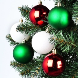 Połyskujące czerwone, matowe zielone i białe brokatowe bombki tworzą piękny kontrast i świąteczny blask.