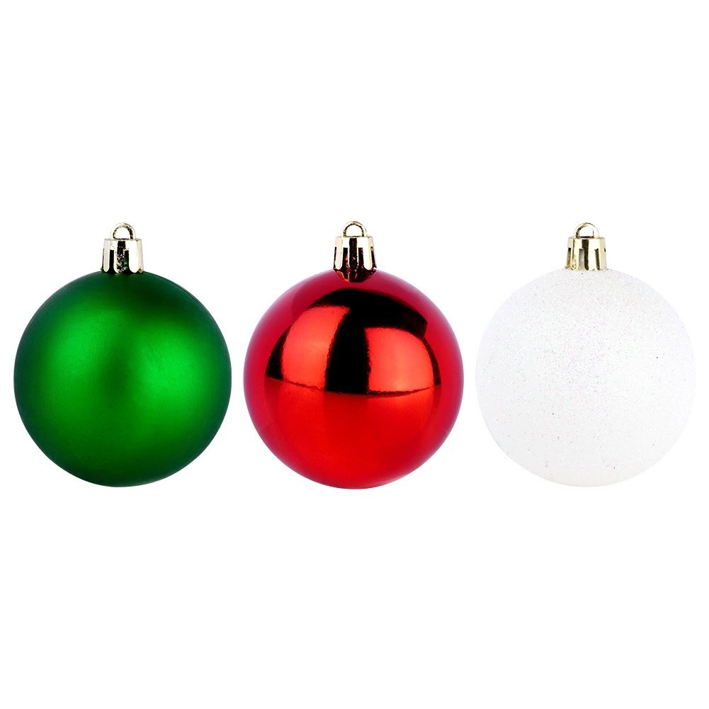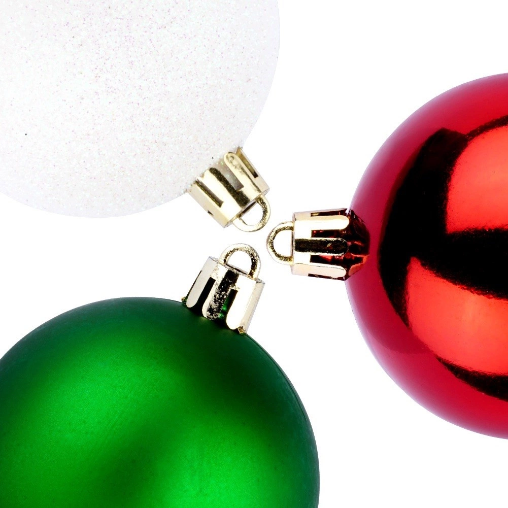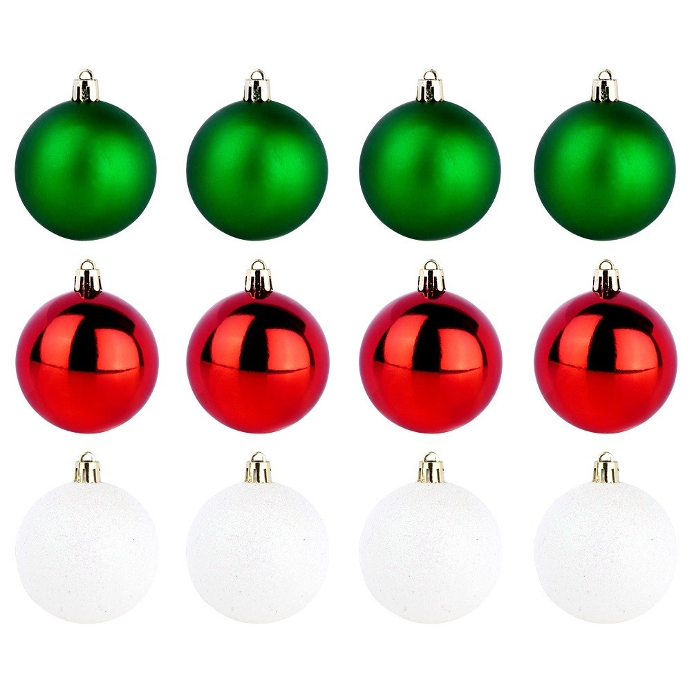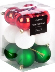 Stylowy zestaw 12 bombek w kolorach czerwonym, zielonym i białym o średnicy 6 cm. Bombki są nietłukące, mają połyskliwe, matowe i brokatowe wykończenia, a dzięki wytrzymałemu tworzywu są bezpieczne w domach z dziećmi i zwierzętami. Idealne na choinkę, wianki i girlandy, aby stworzyć magiczną, świąteczną atmosferę.