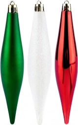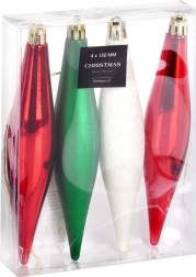 Stwórz w domu magiczny, świąteczny nastrój z dekoracyjnym zestawem 4 ozdób w kształcie kropli o długości 15 cm. Dwie czerwone błyszczące, jedna zielona matowa i jedna biała z brokatem wspólnie zapewnią zrównoważony akcent kolorystyczny na każdej choince i w świątecznych aranżacjach. Dzięki niezbijalnemu materiałowi wyglądają jak szklane, ale są znacznie trwalsze i bezpieczniejsze.