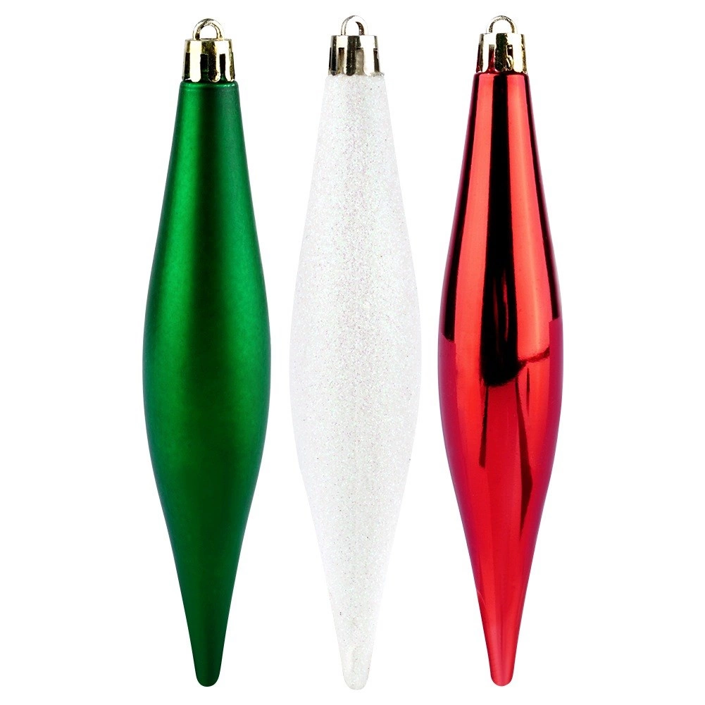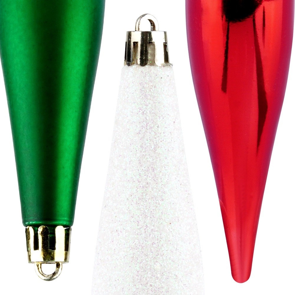 Elegancki zestaw czterech świątecznych ozdób w kształcie kropli w kolorach czerwonym, zielonym i białym doda Twoim dekoracjom olśniewającego blasku i świątecznej atmosfery. Ozdoby są niezbijalne, lekkie i bezpieczne dla domów z dziećmi oraz zwierzętami. Połączenie wykończeń połysk, mat i brokat zapewnia stylową różnorodność na choinkę, wieńce i girlandy.