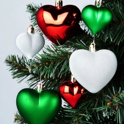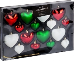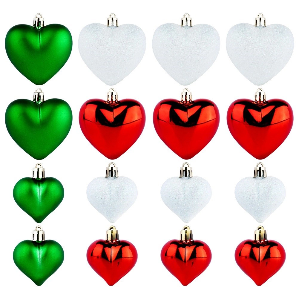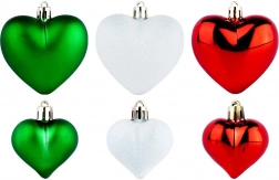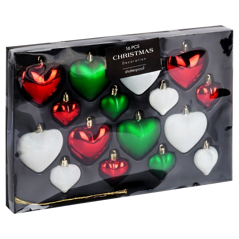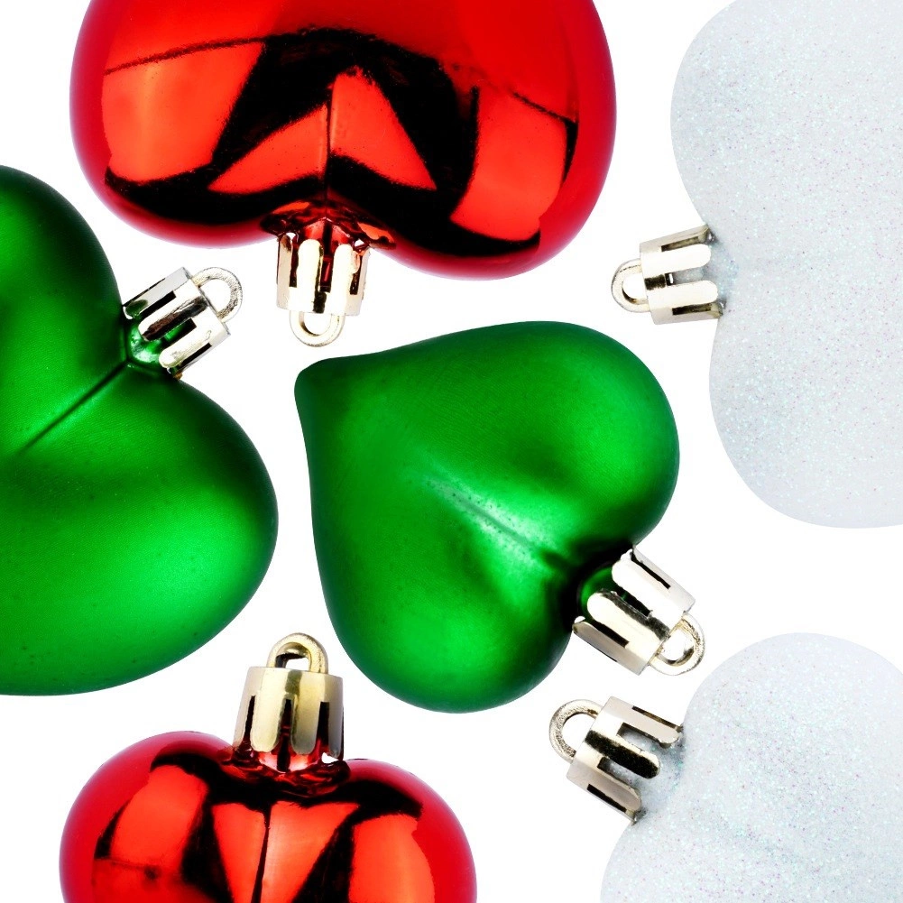 Elegancki zestaw 16 nietłukących ozdób świątecznych w kształcie serca w kolorach czerwonym, zielonym i białym doda Twoim dekoracjom klasycznego blasku i stworzy magiczny, świąteczny nastrój. Połączenie wykończenia na wysoki połysk, matowego i z brokatem oraz dwa rozmiary (6,5 cm i 4,5 cm) świetnie sprawdzą się na choince, wieńcach i girlandach.
