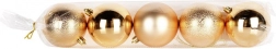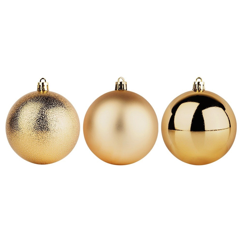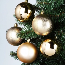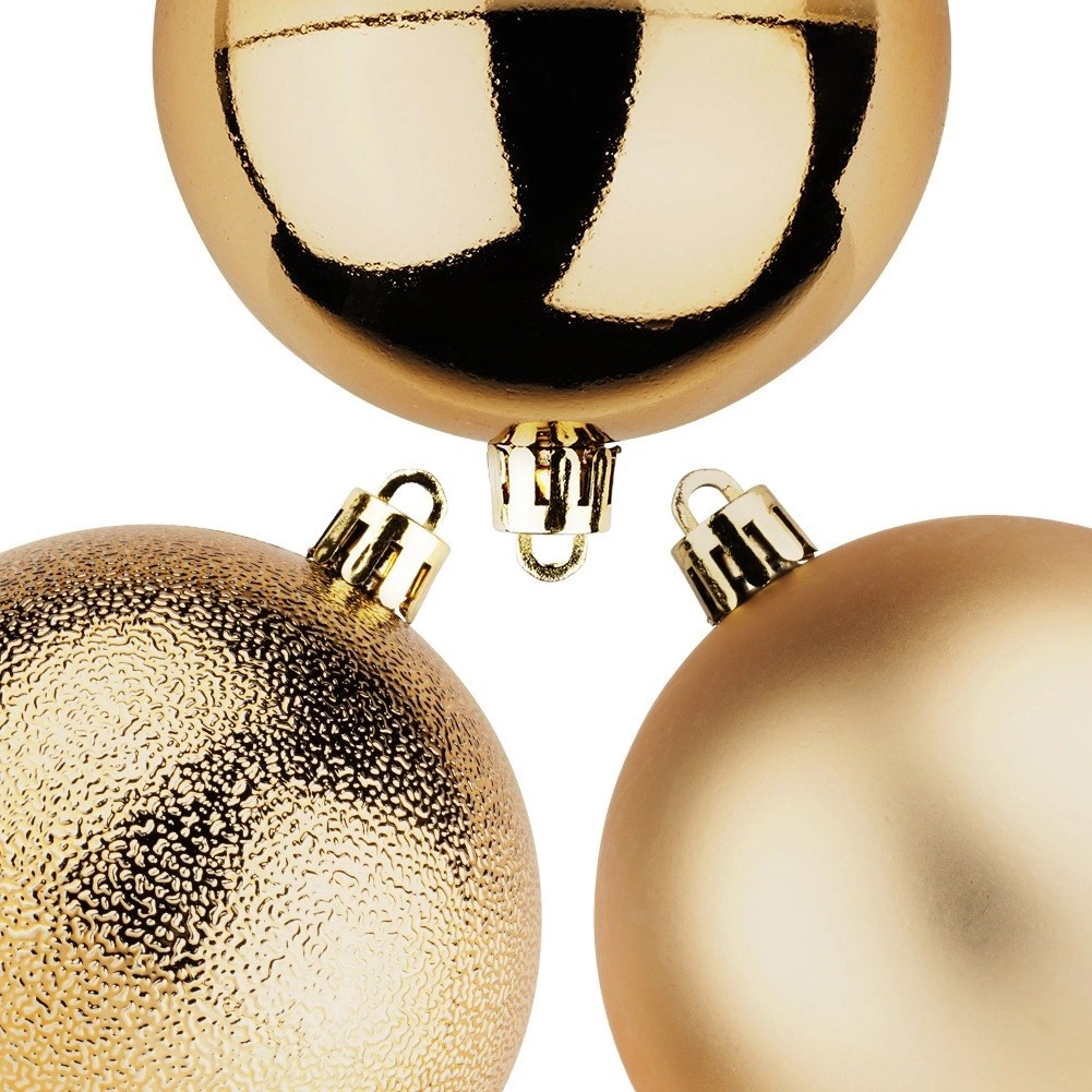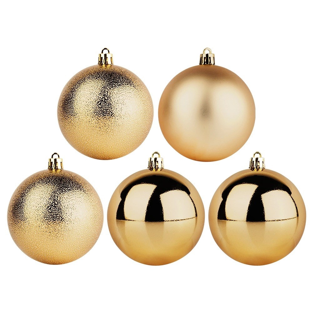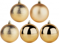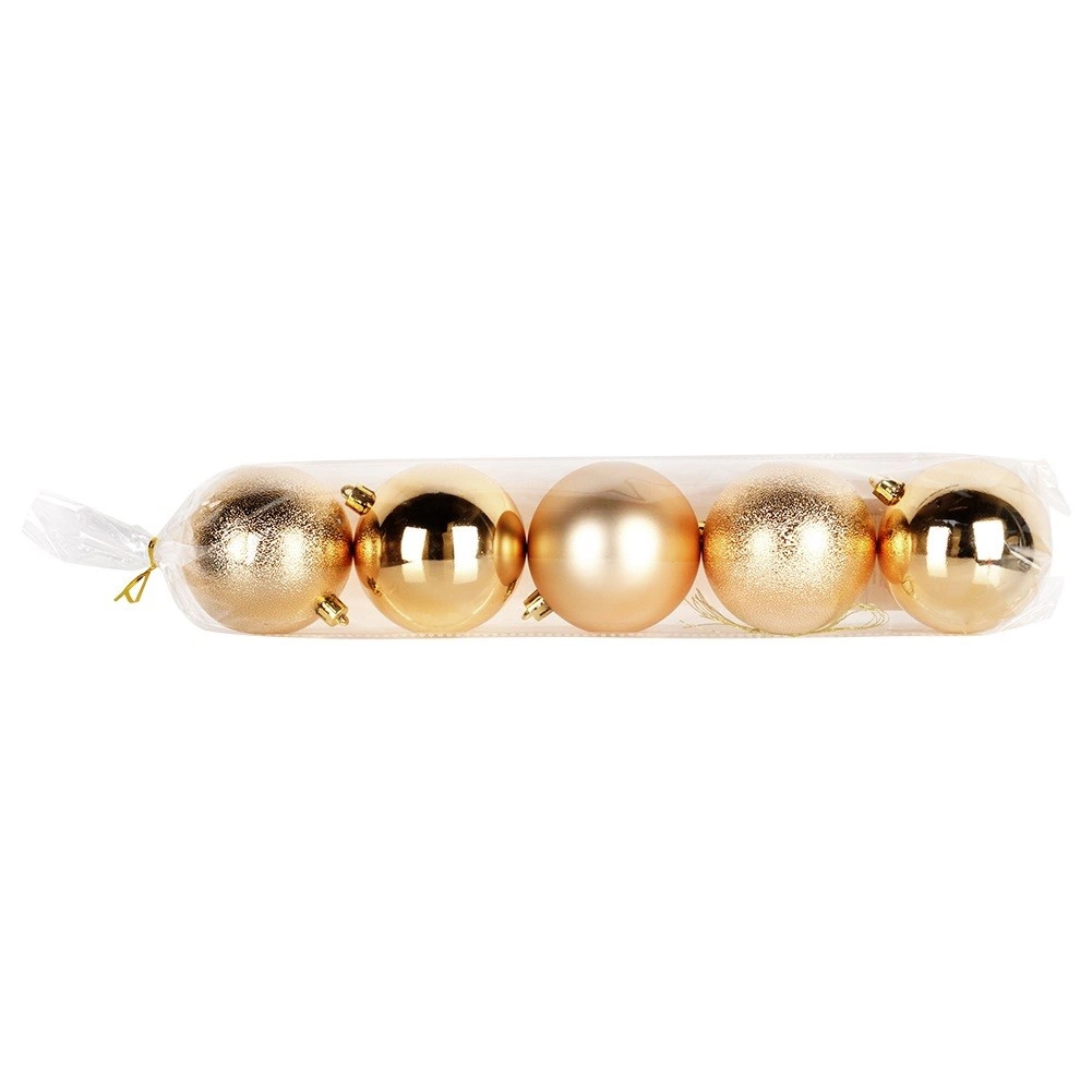 Wprowadź do świątecznych dekoracji harmonię i blask dzięki zestawowi 5 złotych ozdób o średnicy 8 cm. Trwałe, nietłukące wykonanie wiernie imituje szkło, oferując jednocześnie większe bezpieczeństwo i długą żywotność. Połączenie połyskujących, matowych i fakturowanych powierzchni tworzy efektowny kontrast i głębię dekoracji.