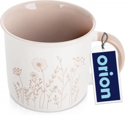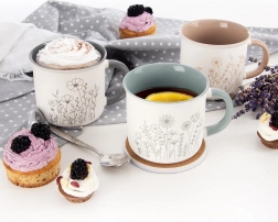 Elegancki porcelanowy kubek o pojemności 400 ml z klasycznym designem, białą powierzchnią oraz beżowym wnętrzem i uchem. Odpowiedni do zmywarki i kuchenki mikrofalowej, idealny do kawy, herbaty czy kakao. Dekor z motywem łąkowych kwiatów oraz wygodne ergonomiczne ucho do codziennego użytku.
